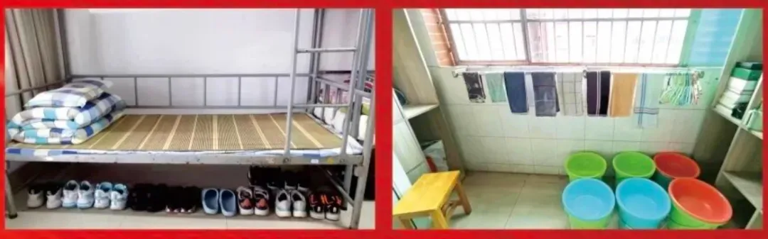 附中寝室4-6人/间,上下铁床,有空调,每个学生有可上锁的储物柜,男生宿舍大多为独立卫浴,女生宿舍多为公共卫浴,一般每四个宿舍有一个公共洗漱间,内有4个洗澡间,两台公共洗衣机。