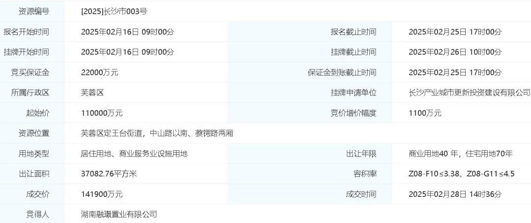 在完成调规后,地块在去年2月正式挂牌,编号为[2026]长沙市003号。2月26日开启竞拍后,共计吸引中海、建发、郴州融华3家房企竞拍,在出价30轮后被郴州融华收入囊中。溢价率29%,楼面价达9435元/㎡。