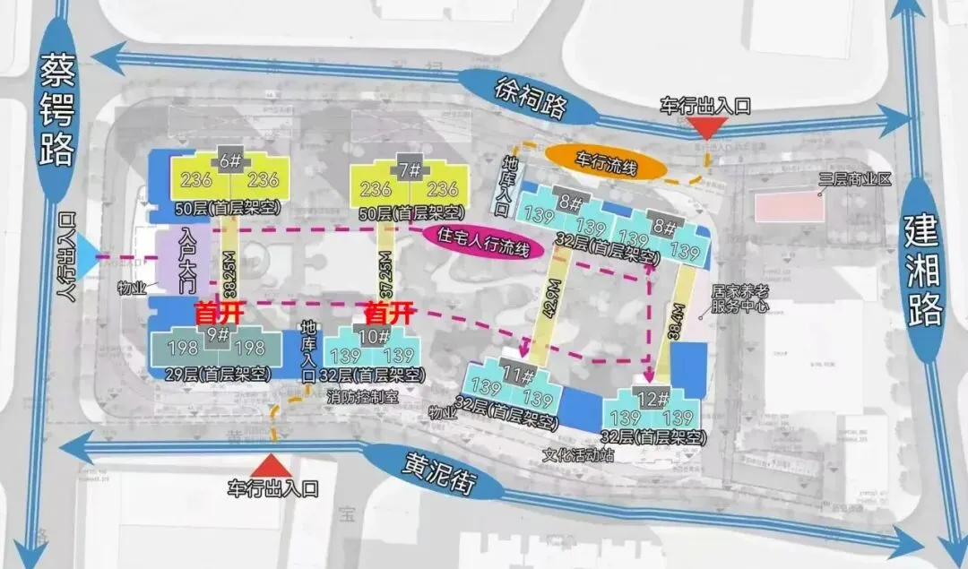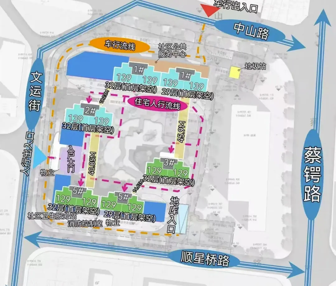 这个项目从去年2月26日正式拿地,距今刚好一年左右。项目由两个地块组成,北地块主打刚改,南地块主打改善,产品品质不错。但地处市中心,可能面临低楼层采光不足、周边居住环境一般等问题。
