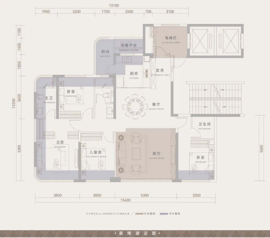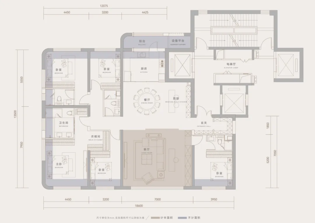 该户型得房率约112%(含电梯厅),若除去8.5㎡电梯厅,实际得房率约为105%。
