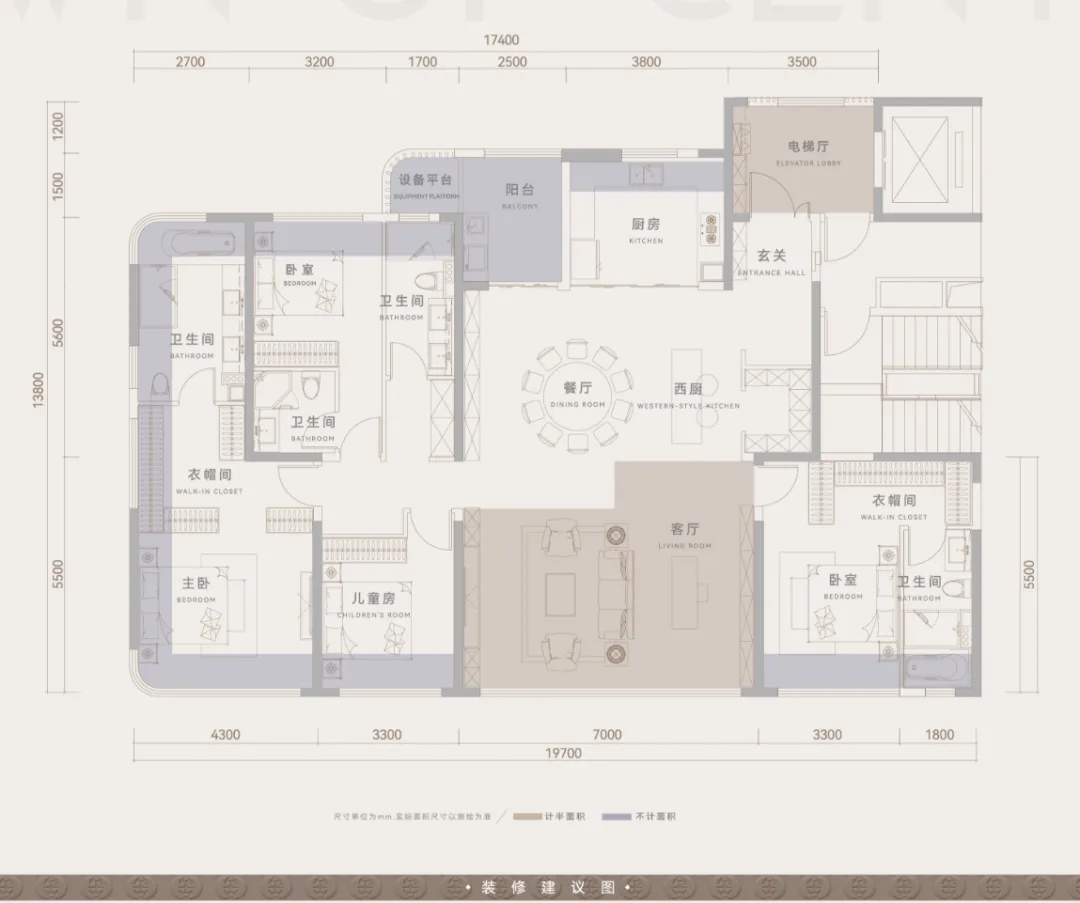 236㎡五房两厅四卫户型,坐落在超高层的6#和7#,多配置了一个电梯,因此得房率略低,含电梯厅的得房率约105%,不含电梯厅的得房率则低于100%。
