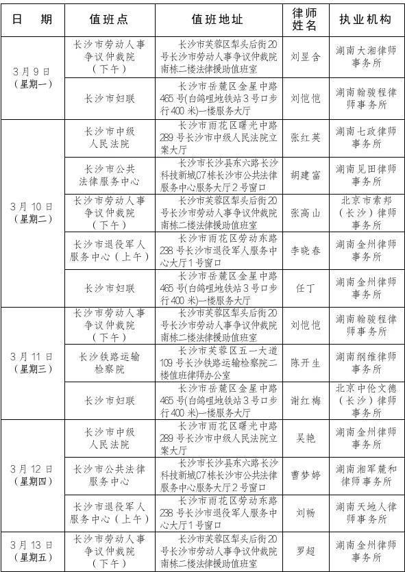 值班安排 | 长沙市法律援助中心驻点律师值班信息(3月9日-3月13日)