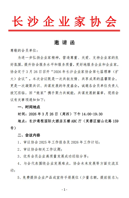 2026年长沙企业家协会第七届理事(扩大)会议邀请函
