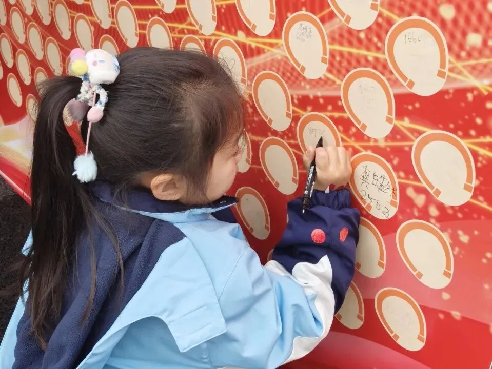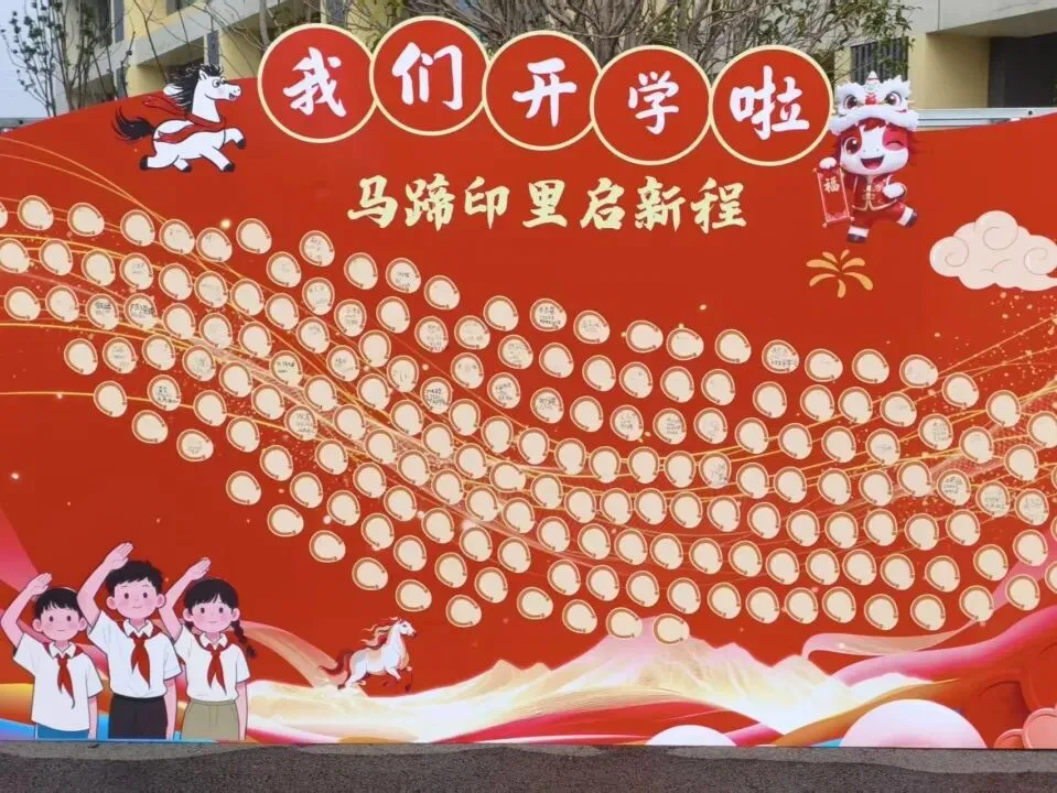 行政楼前的“马蹄签到墙”成为热门打卡点,同学们认真写下姓名、“雷小锋”编号,新学期的心愿悄悄写进马蹄印里:“新学期考进班级前十”“希望能交到更多好朋友”“愿自己越来越勇敢”…… 小小的印记承载着大大的梦想,也寓意着少年们以“雷小锋”之名,脚踏实地、步步留印,在新征程上稳步前行。写完心愿的同学领取【启志骏】贴纸,与签名合影,定格对新学期的美好憧憬。