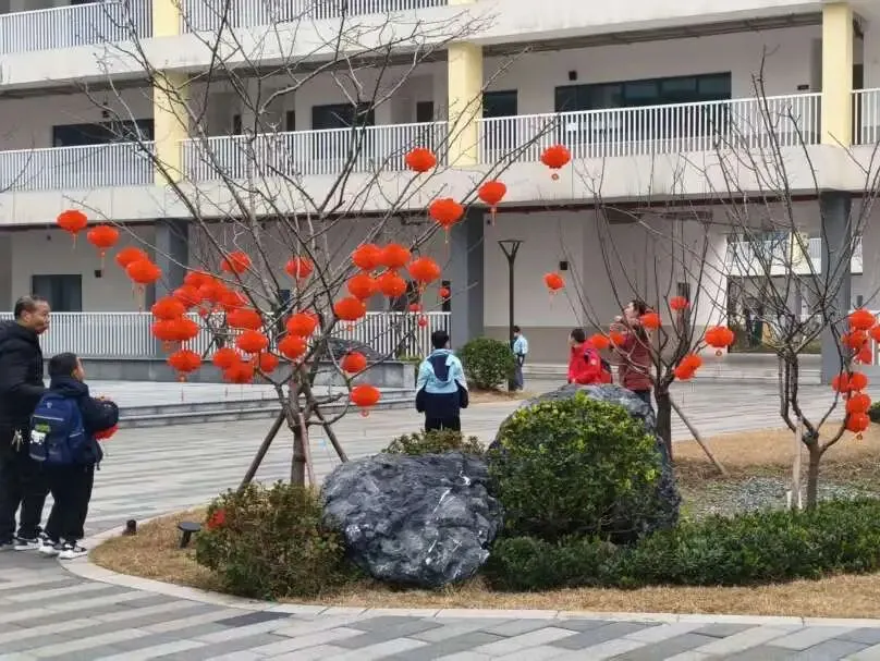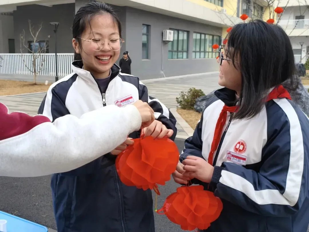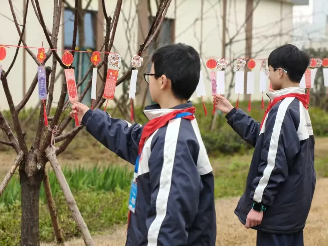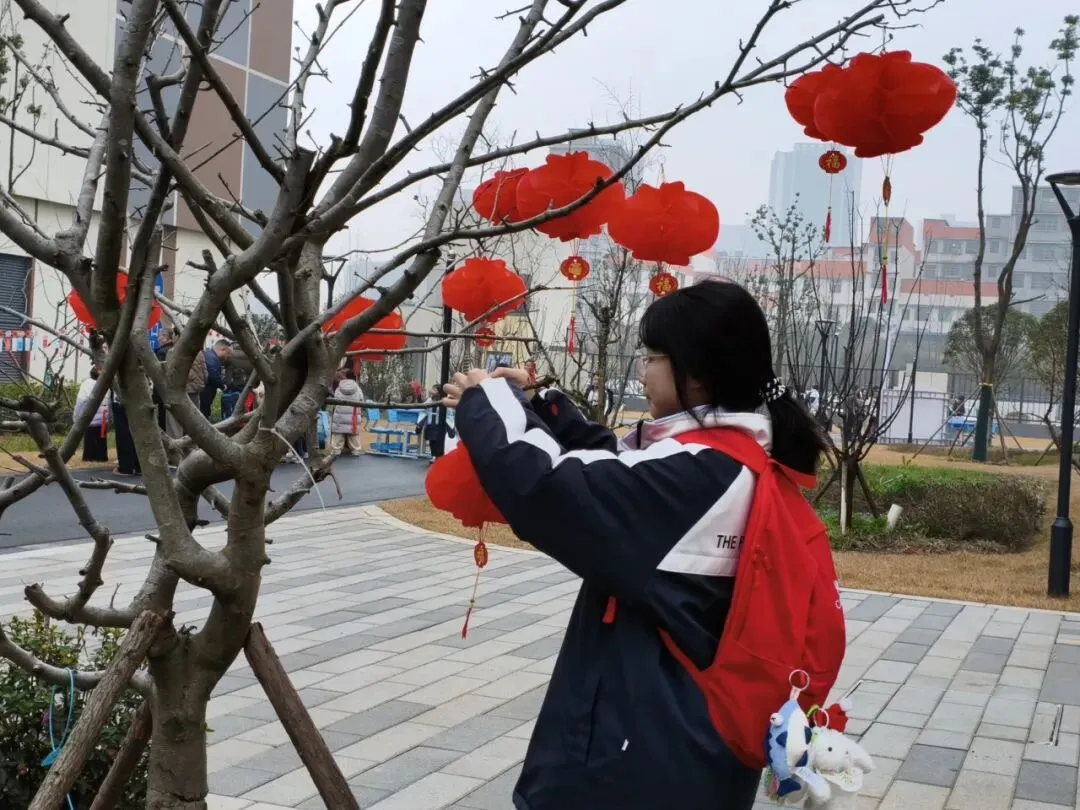 主干道旁的树木区域,同学们化身“春日小使者”,将元宵灯笼细心挂于枝头,红彤彤的灯笼点缀在嫩绿的枝桠间,校园瞬间多了一抹春的色彩。同学们用巧手绘就美景,顺利收获【巧手骏】贴纸,成就感拉满!