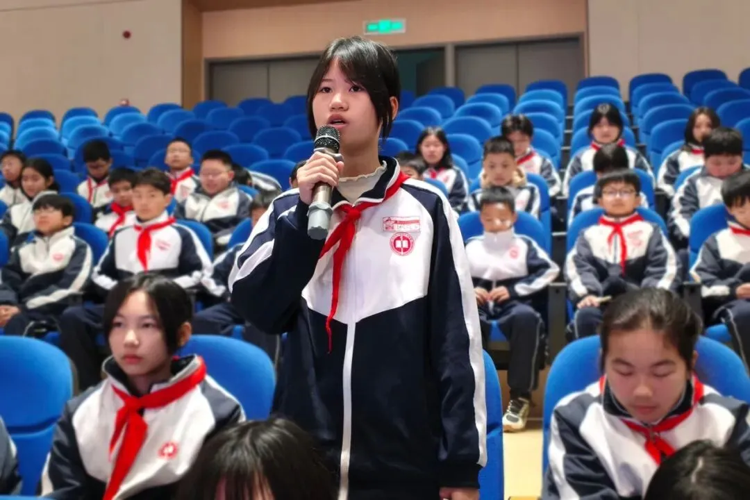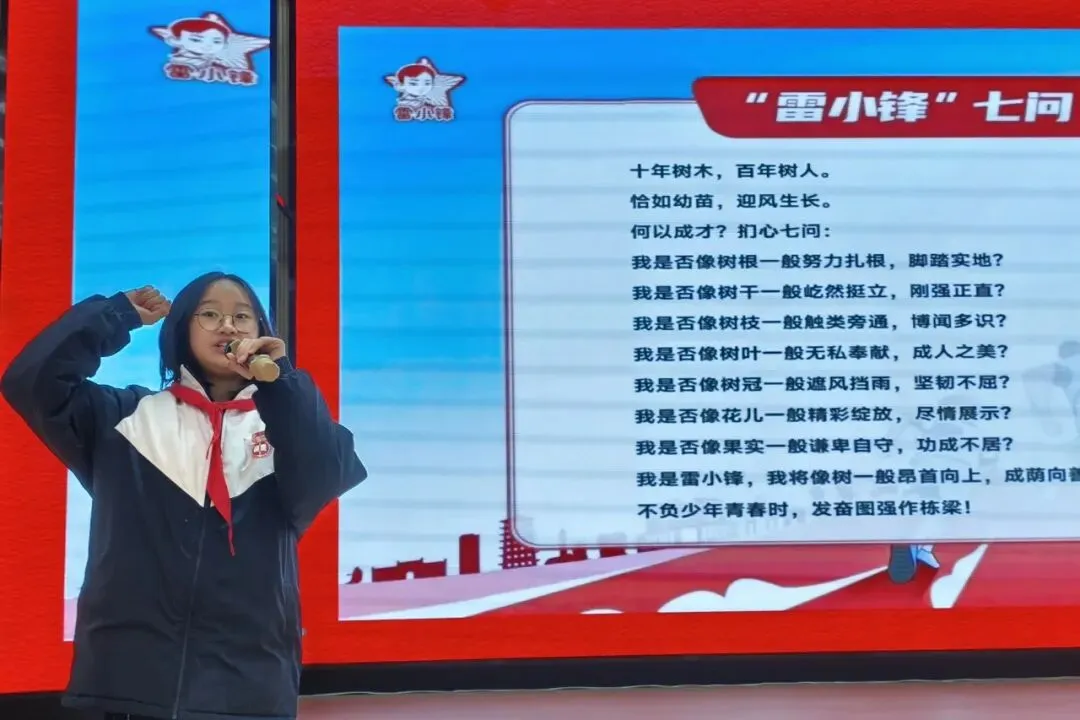 铮铮誓言,砥砺初心。领誓人051426号“雷小锋”唐一萱同学带领全体学生进行 “雷小锋七问”宣誓,同学们高举右手,字字铿锵。坚定的誓言在现场久久回荡,彰显了一中大泽湖学子崇德向善、奋发向上、逐光向阳的精神风貌。
