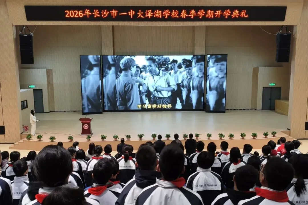 春潮涌动启新程,雷锋精神永相传。3月5日,在万物复苏的美好时节,恰逢“学雷锋纪念日”,长沙市一中大泽湖学校全体师生齐聚行政楼二楼多媒体报告厅,隆重举行 2026年春季开学典礼。本次典礼以“骐骥踏春启新学,雷锋精神伴我行”为主题,表彰先进、寄语成长,让雷锋精神融入新学期的逐梦征程,激励全体师生以昂扬之姿奔赴新的学习与生活。