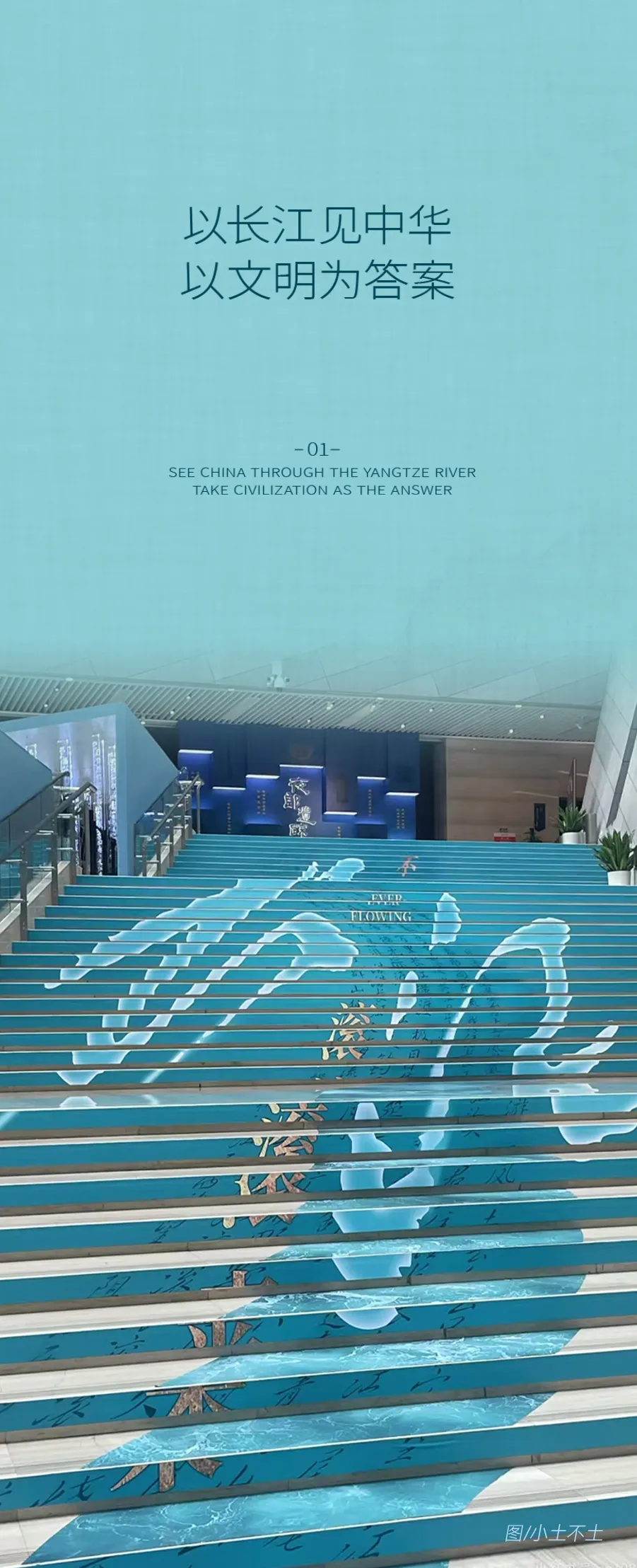 此外,我们希望极致拓展陈列空间,所以在中庭台阶上铺贴“一条大河”地面装置,让观众沿“江”而上,打造第一重观感上的“不尽长江”概念。