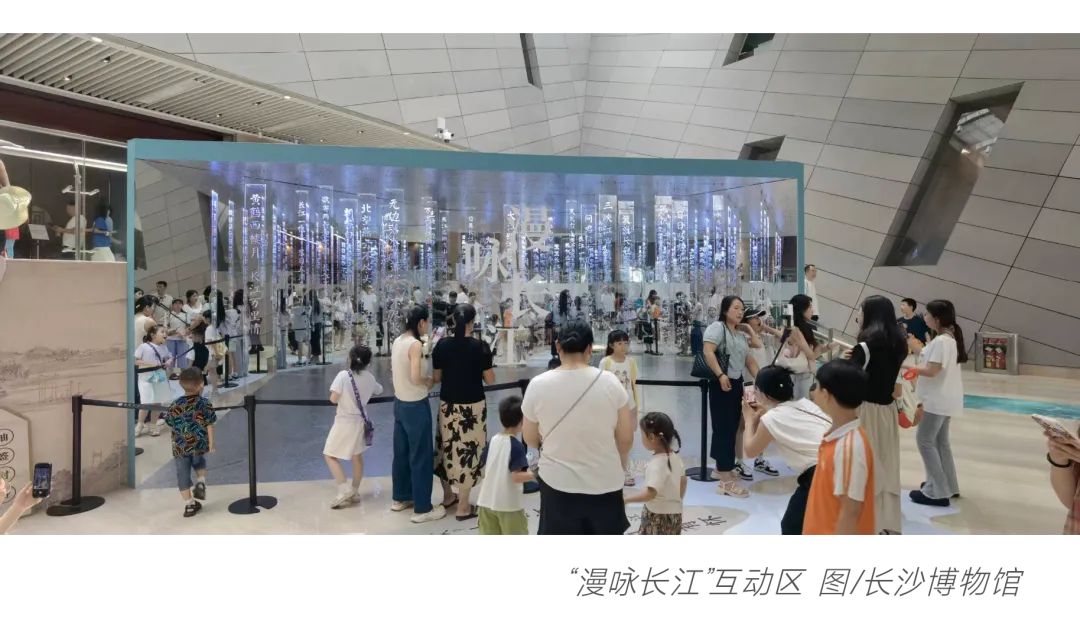 而台阶上的“漫咏长江”互动区,包含歌咏、画咏、诗咏三个板块,力求通过互动小程序让观众多维度感知长江和中华文明。