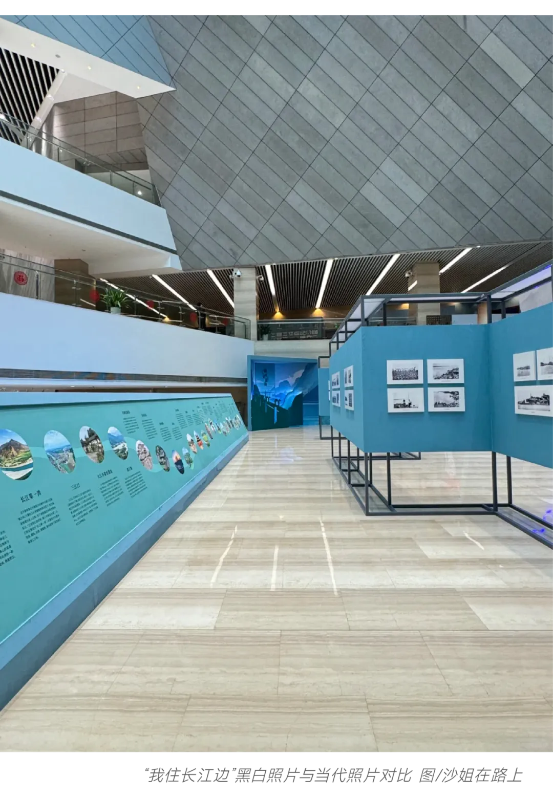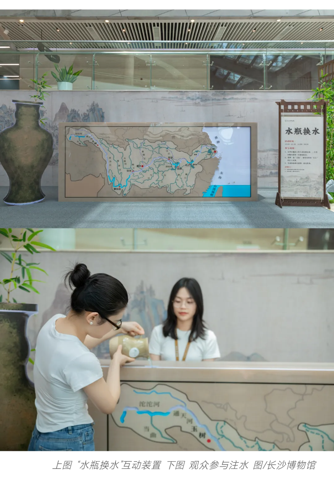 中庭台阶上的“我住长江边”板块,展示了20世纪20年代长江沿岸城市的黑白照片和现在的照片。观众会比对自己去过的地方,无形之中就代入了展览。还有向长江注水的互动装置:工作人员从湘江取水,由观众向几条代表性支流注水,水流入主干后汇入大海。