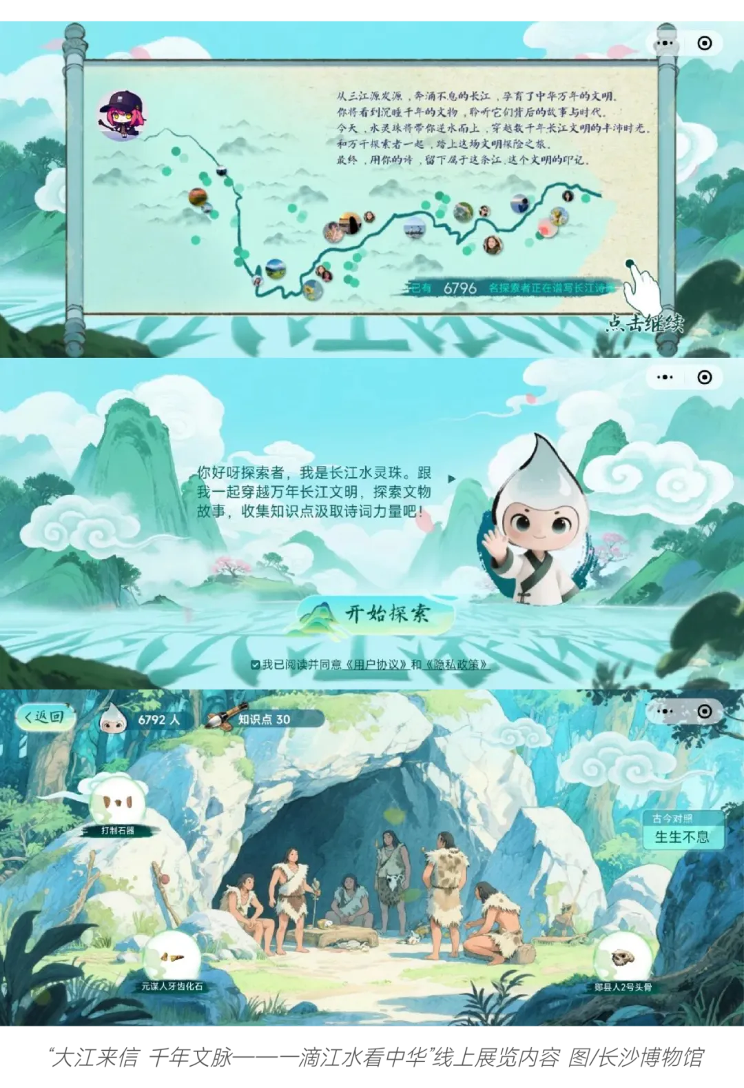 区别于以往线上与线下展完全一致的模式,这次我们专门打造了“大江来信 千年文脉——一滴江水看中华”线上展,与线下展览内涵一致但不雷同。从青藏高原出发,以长江一滴水的视角,通过它所经历的故事讲述长江文明进程。
