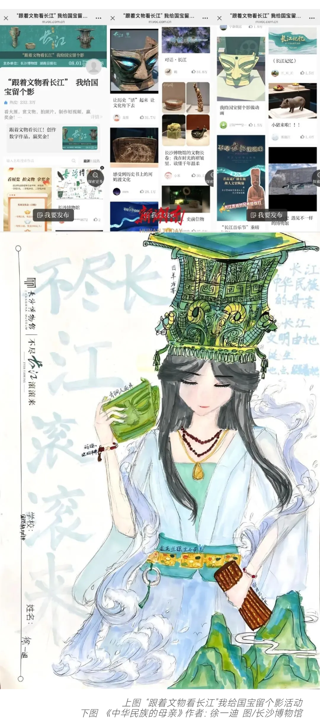 在线上,我们还开展了“跟着文物看长江”“我给国宝留个影”等活动。有一个获奖作品是一位女性的头上和衣服上装饰着展厅中的多件文物,创意十足。