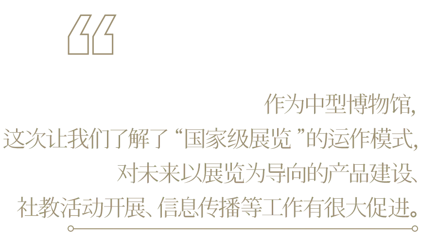 作为地市级博物馆,以往我们的认知有一定局限性,这次大领域主题展览的策划让我们的思维得到极大开拓和提升。全馆上下也增强了自豪感,是一次很好的练兵。今后有类似机会或者我们主动做大型展,就不是打无准备之仗。这是我们最大的收获,也为和我们同类型的博物馆提供了经验,增强了信心。