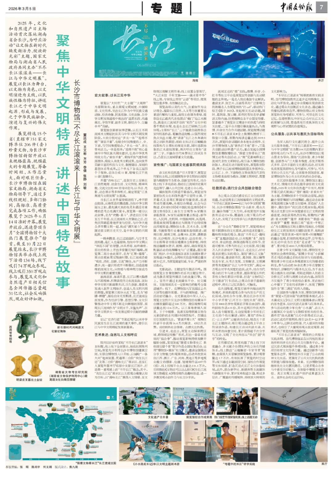 2025年文化和自然遗产日主场城市活动首次落地湖南省会长沙。为呼应活动“让文物在新时代焕发新活力、绽放新光彩”的主题,国家文物局与湖南省人民政府共同举办“不尽长江滚滚来——长江与中华文明展”。