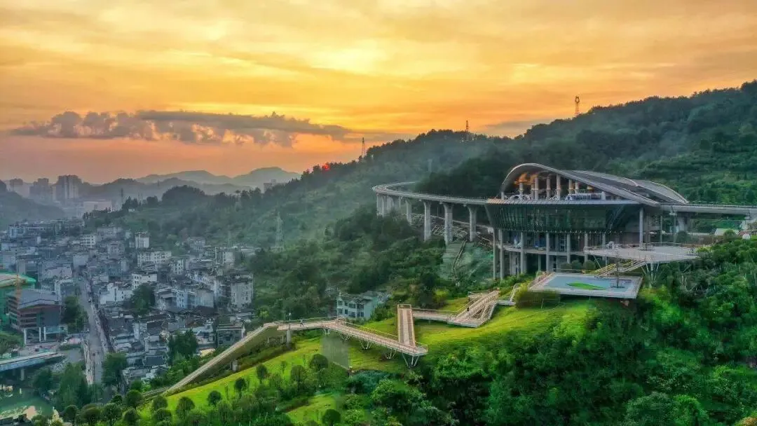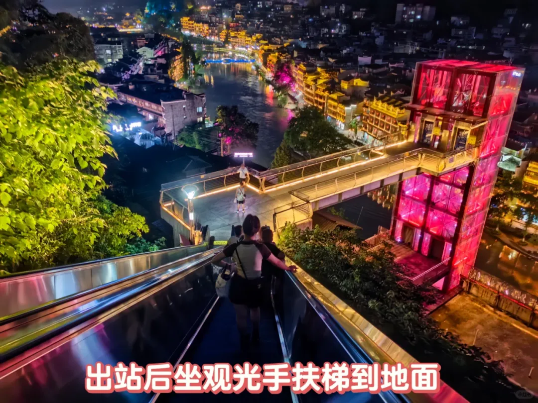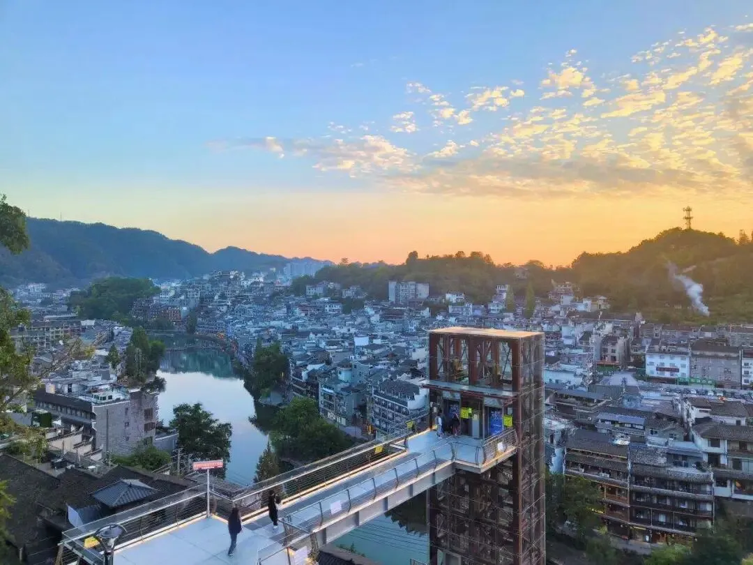 后乘坐磁悬浮直达【凤凰之眼·揽胜站】车站的整体造型酷似风凰眼,站点位置为俯瞰沱江和古城的最佳位置,车站设计三层宽敞的观景平台,游客可以置身车站观景、与风凰古城合影,居高临下的视角,感受沈从文笔下别样的“流水、渡船、人家”;