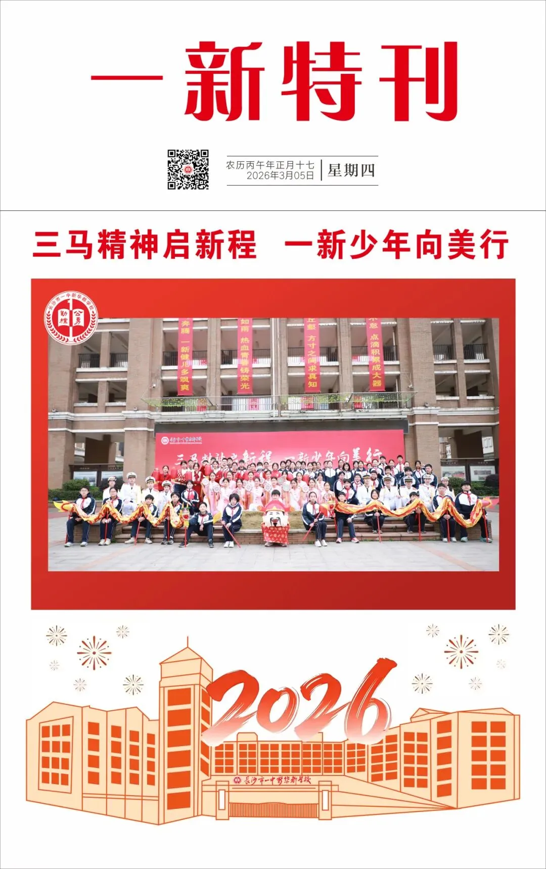 三马凌云酬壮志,一新拔节向春光。2026年3月5日,长沙市一中新华都学校全体师生齐聚田径场,隆重举行2026年春季开学典礼暨“三马精神启新程 一新少年向美行”开学第一课活动。本次活动旨在将“德育+美育”深度融合,以文化人、以美育人,引导学生从身边榜样中感受美、践行美,将个人成长与国家发展蓝图紧密结合,争做有审美、有品德、有理想的新时代好少年。