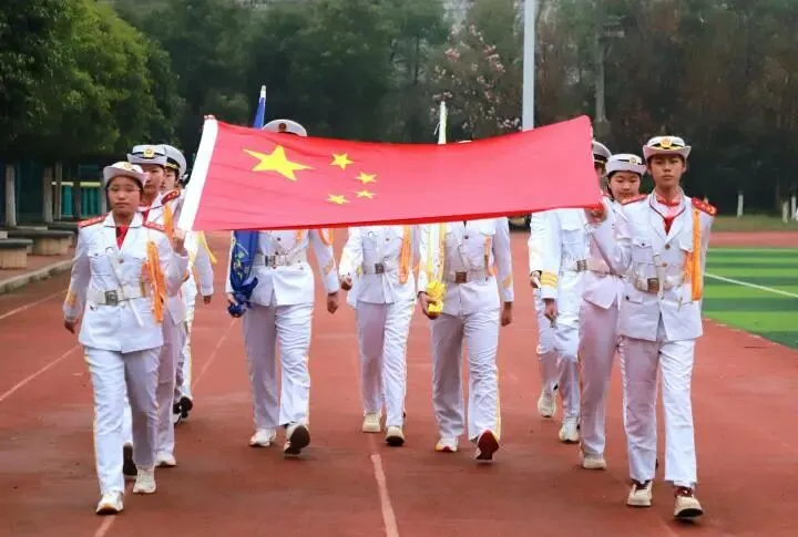 开学典礼在庄严的升旗仪式中正式开始。国旗护卫队迈着铿锵有力的步伐护送国旗入场,全体师生肃立注目,高唱国歌,五星红旗在田径场上空冉冉升起。