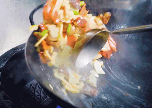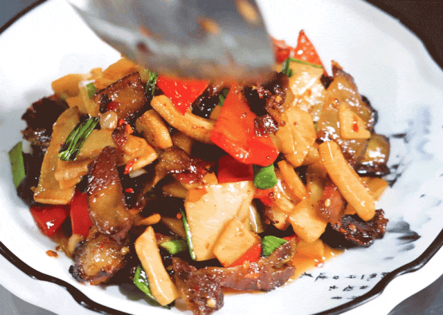 剥去外皮,将笋切成薄片,和农家腊肉一起下锅翻炒。腊肉的熏香和春笋的清甜在热气里交融,冬春两季的味道在这一盘里完美相遇。