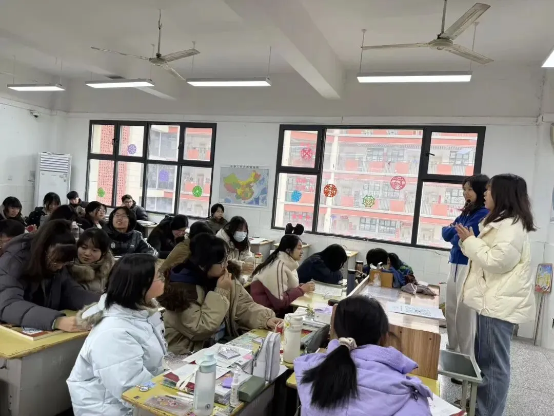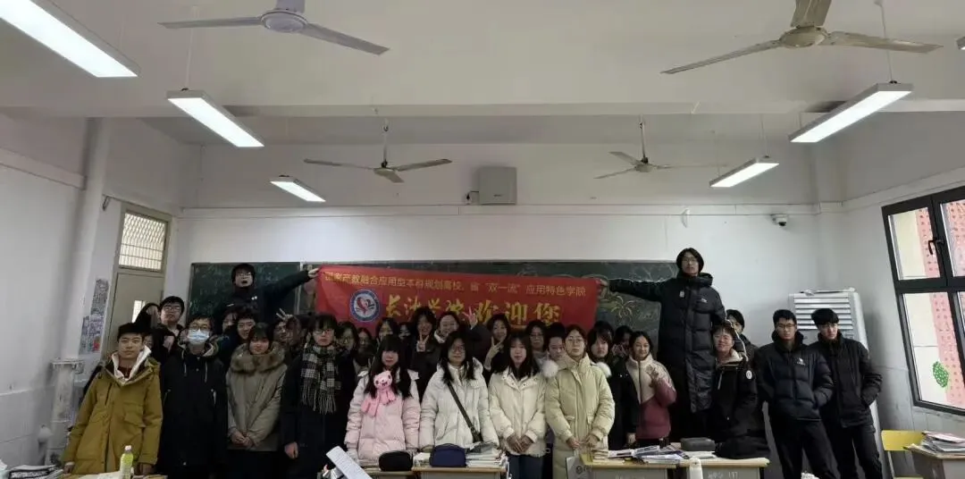 与学弟学妹合影,班级内欢声笑语,同学们主动互动,摆出创意姿势,定格青春瞬间,记录交流的美好时刻,传递高校的温暖与亲切感。