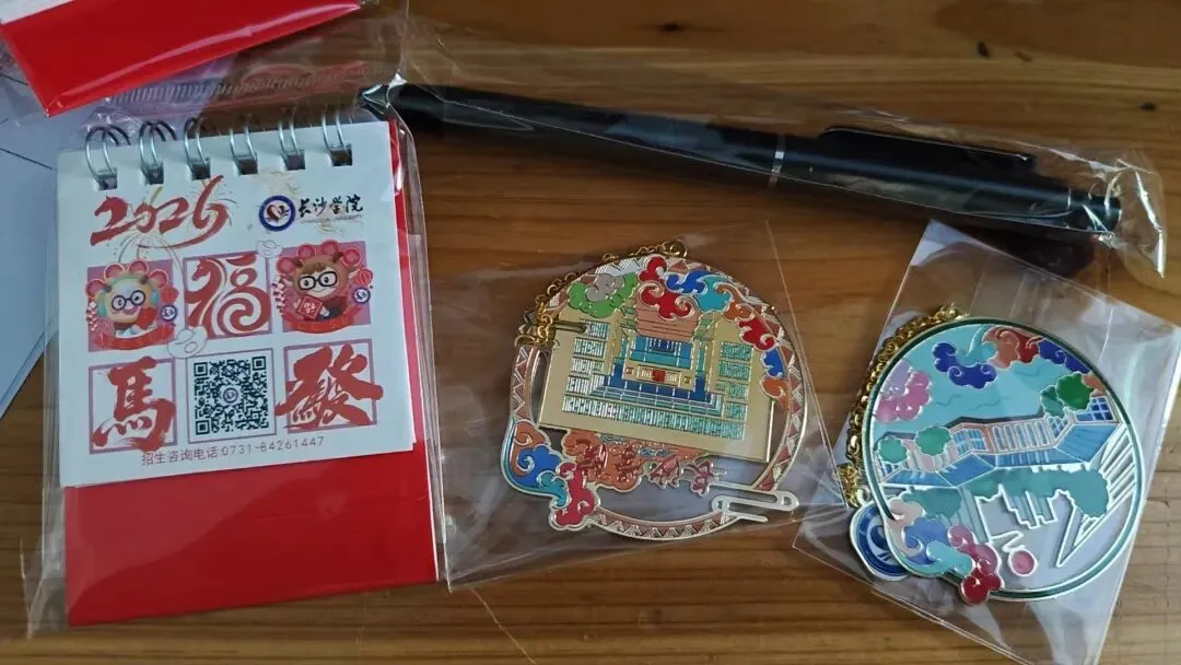 纸短情长,艺心筑梦。长沙学院艺术设计学院发挥专业所长,为岳阳五中的学弟学妹们量身打造了这份“独家记忆”。以非遗美学为骨,以校园地标为形,将中学标志性建筑融入金属镂空工艺;搭配印刻着长大学子祝福的定制台历与签字笔,让实用与情怀兼具。每一份礼物都凝聚着学长学姐的匠心,愿这份满载期许的心意,能成为你们逐梦路上的温暖陪伴。