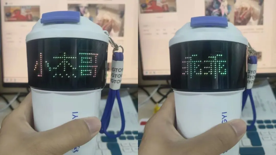 记得那天领到小礼品时,我还兴奋地拍给你看,这个杯子居然带显示屏!然后迅速在屏幕上打出了我们俩的名字。