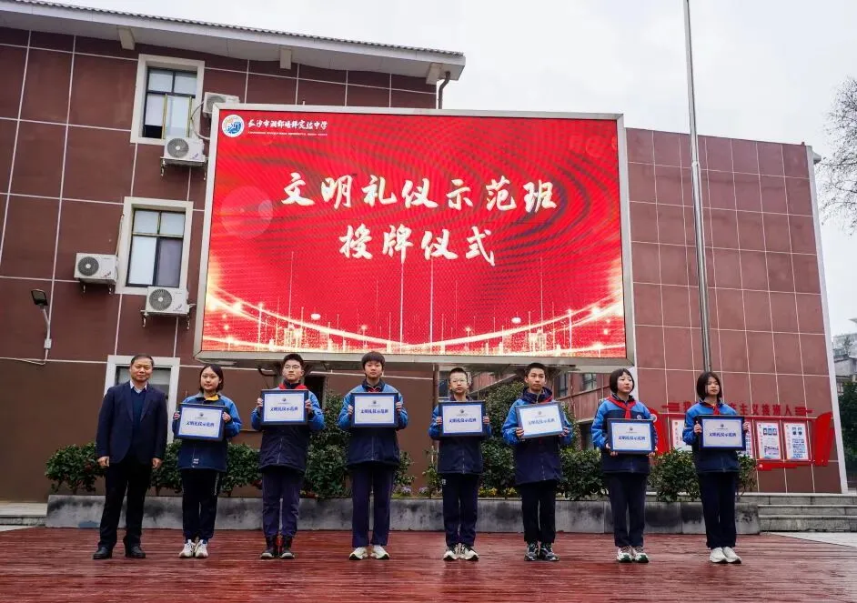 罗清华书记为“文明礼仪示范班”获奖班级颁发牌匾,勉励全体同学以示范班为榜样,从日常点滴做起,涵养文明素养,让礼仪之花开遍校园。