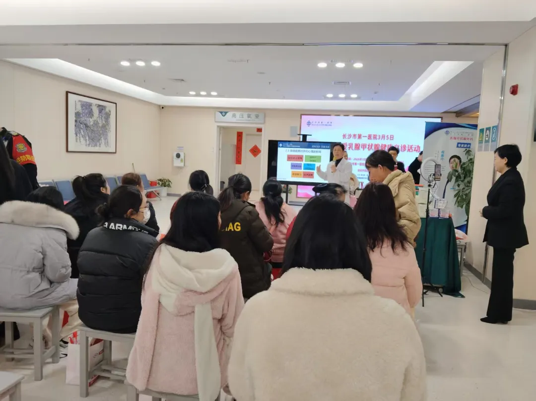 3月5日,乳甲外科开展“学雷锋关爱乳腺甲状腺健康”义诊活动。科主任蒋雅玲带领团队,在捞刀河院区1栋1楼门诊大厅为市民提供乳腺、甲状腺疾病的免费筛查、健康咨询及诊疗建议。