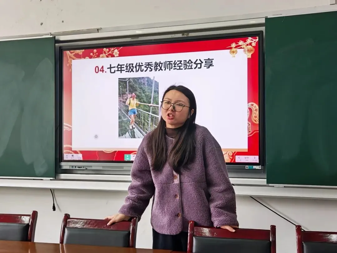 2. 八年级提质:蒋翠老师——习惯为基,激活内驱。蒋翠老师围绕“习惯养成与能力提升”,分享八年级教学创新实践:• 可视化成长管理:动态记录学生课堂表现和作业情况,让进步“看得见”,激发学习内驱力。 • 自然拼读渗透:在单词教学中融入拼读规则,设计“拼读卡”“单词闯关游戏”,帮助学生破解记忆难题,实现“见词能读,听音能写”。 • 听读习惯培养:利用“Hello Carrie”动画资源进行语音示范,强调听和读的重要性,通过“单词串烧”提升语言运用能力。 • 情绪调动艺术:通过小组竞赛、角色扮演等活动活跃课堂氛围,让学习从“被动接受”转向“主动参与”。