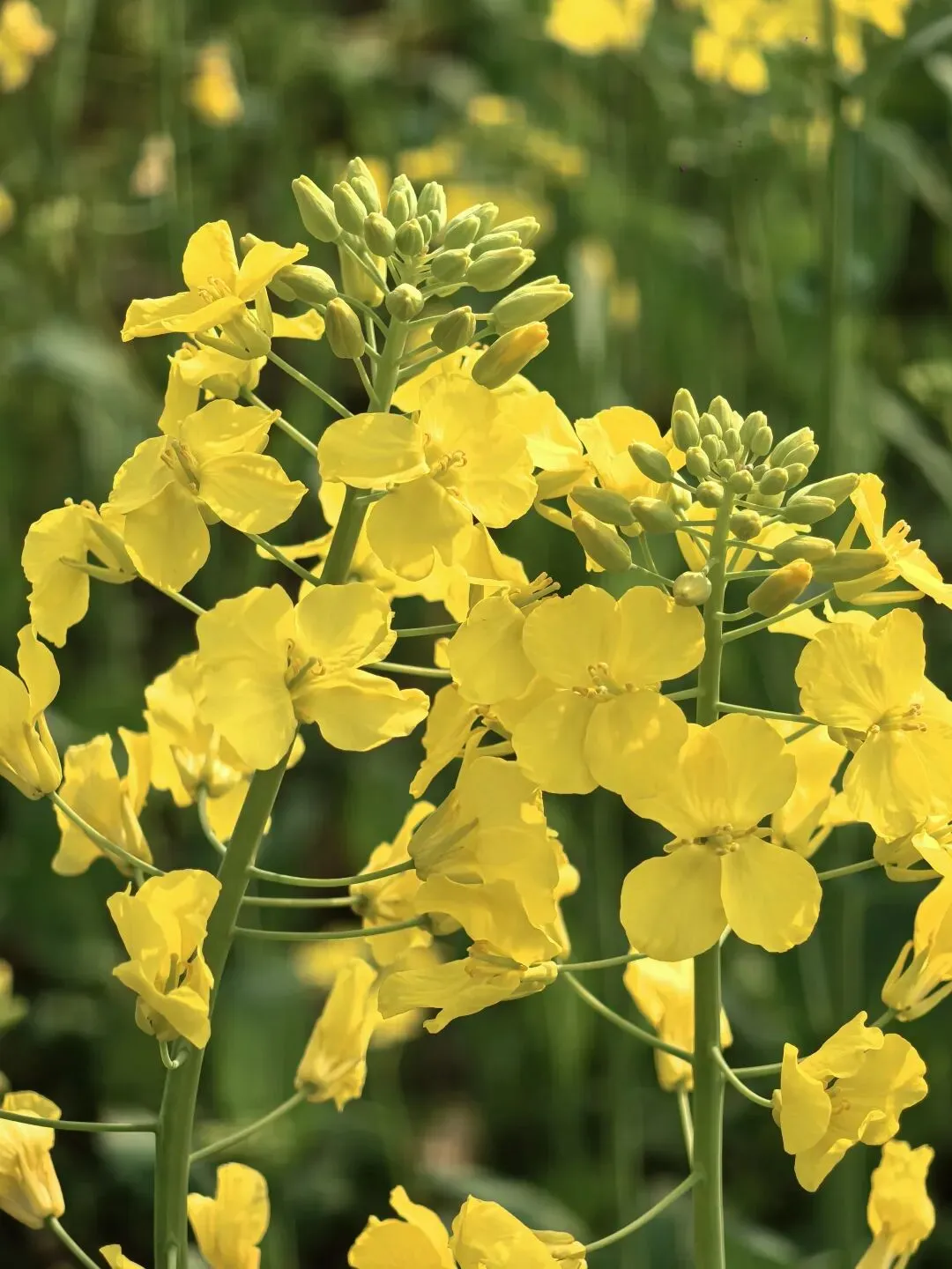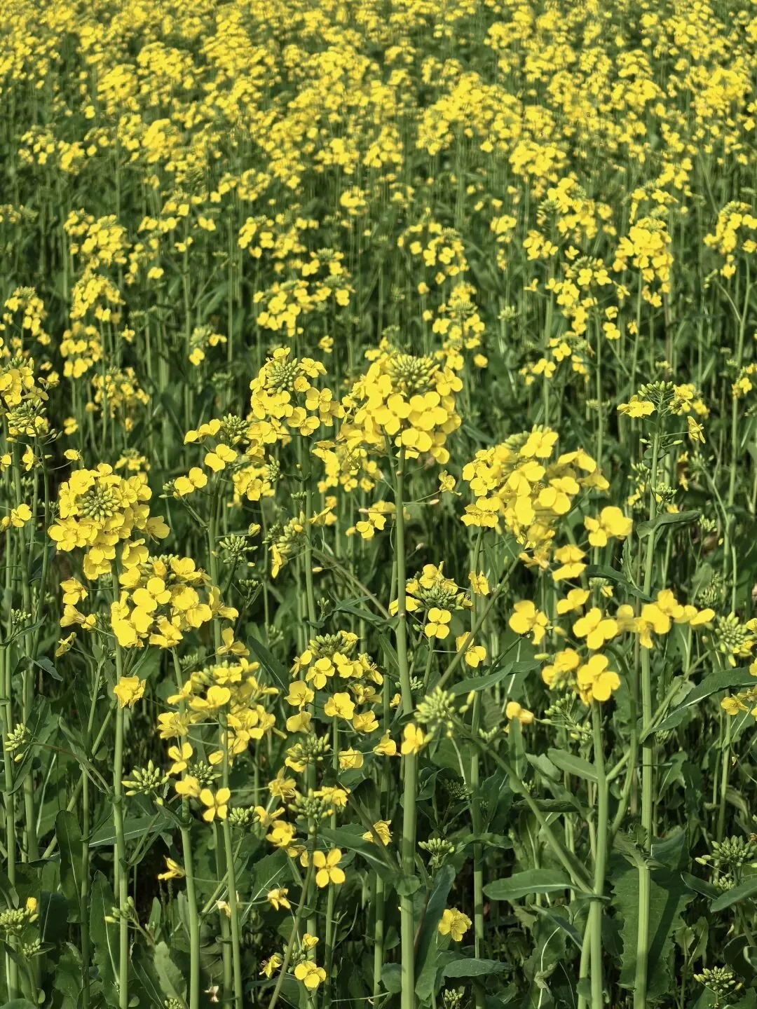 人还未到,春风便送来了浓郁的油菜花香。走进花海,四周被金黄色包围着。微风吹过,金黄色荡漾起伏,如一首流动的乐曲。心情也随着这金色花浪愉悦跳跃!置身花海,耳朵边全是“嗡嗡嗡”的声音,这是蜜蜂大型交响乐现场。成千上万的小蜜蜂,抓住这好时节,正在辛勤地劳作。采集油菜花蜜的同时,也在帮助植物传粉,繁衍后代。四片薄薄的花瓣,像一只只黄色的小蝴蝶,伫立在翠绿笔直的花茎上。正是这一朵朵单薄的“小蝴蝶”,组成了壮观的黄色花海。田埂狭窄,泥土松软,需小心走路。低头一看,发现了一朵朵的紫色小花,亭亭玉立地点缀在路边。