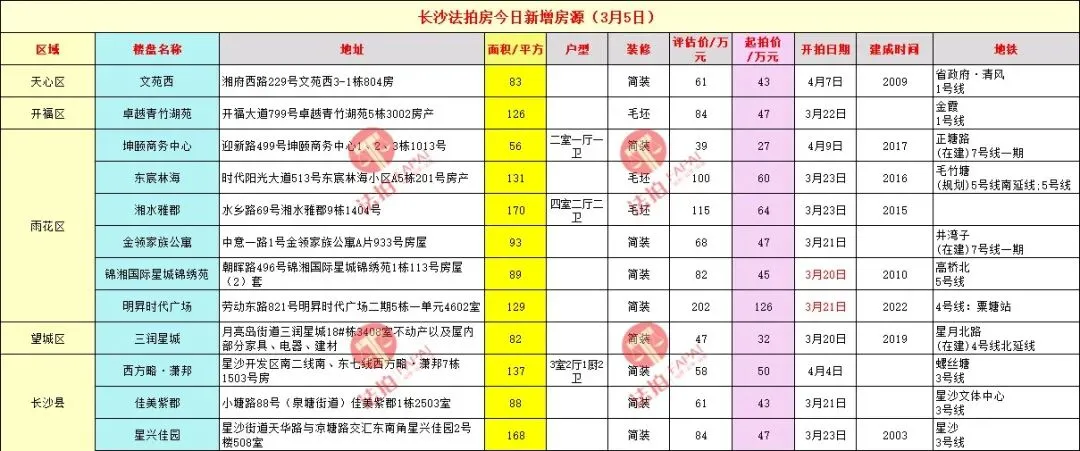 以上就是本次3月5日长沙法拍房新增房源的全解析,如果你对某套房源感兴趣,想要获取更详细的尽调报告,或是了解长沙法拍房的参拍流程、贷款政策,欢迎在后台留言咨询!