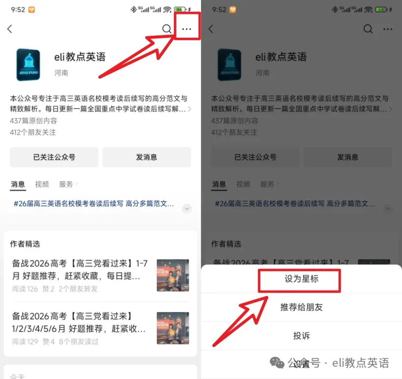 小伙伴们注意:eli每天应该定时 推送,但因信息流乱序,不少人还是错过了干货!鳄梨建议大家把本公众号置顶(设为星标★),以便第一时间 看到推送,方法如下图: