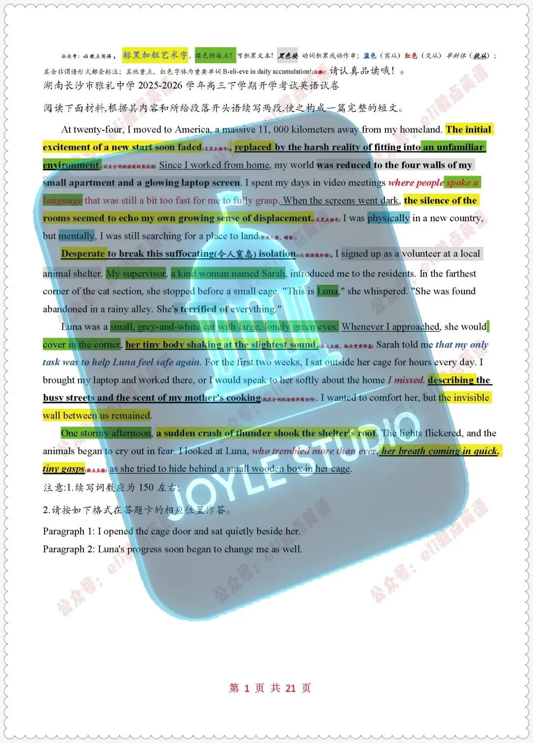9. 读后续写:亲情冲突解决+个人成长类/Li Wei的舞蹈梦,一张签名,一只香囊:母女之间最安静的和解-炎德·英才大联考长郡中学26届高三月卷五