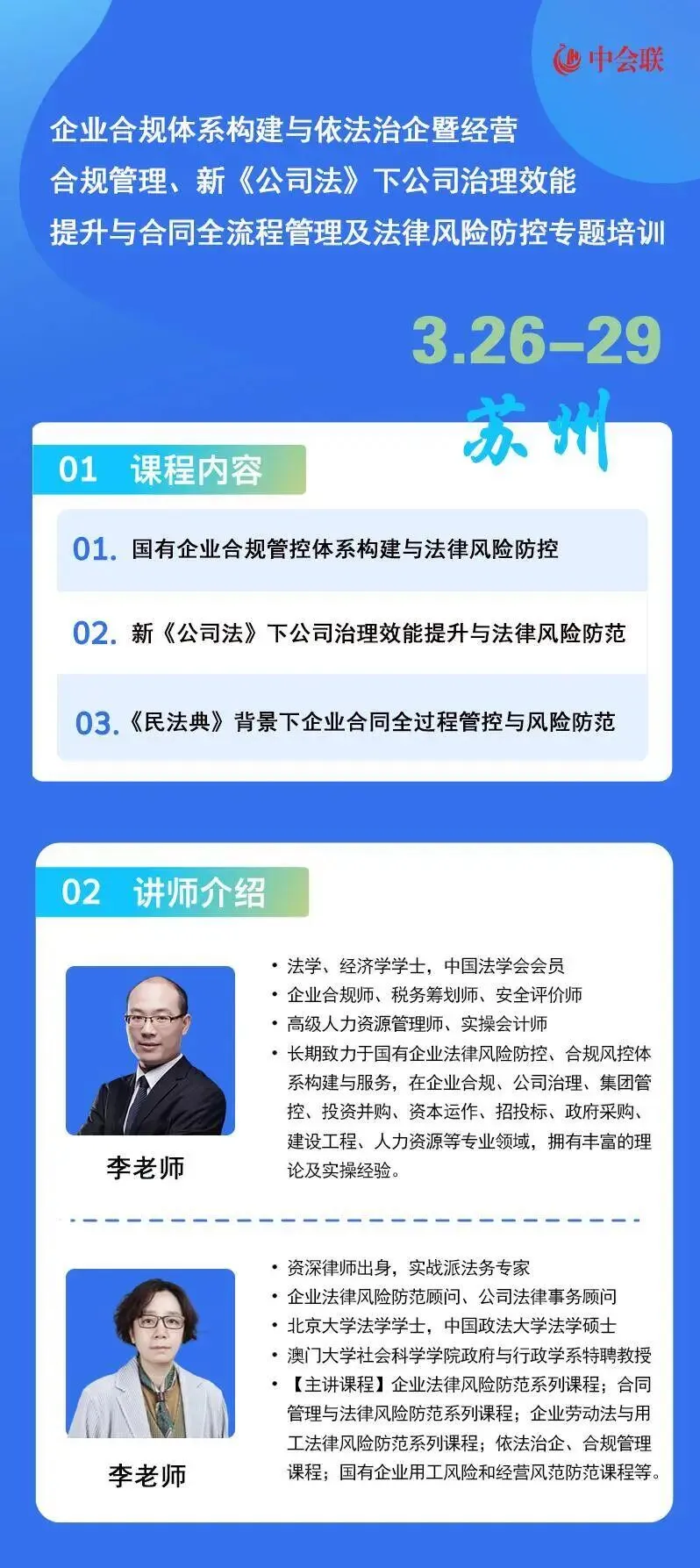 为帮助各单位相关人员深入理解国资委政策要求与强化企业合规经营意识,严守边界、防范风险,系统掌握合规管控顶层设计与经营合规管理核心知识和技能,为企业合规管理工作开展提供有力支撑,并将合规优势转化为企业治理效能与核心竞争力,筑牢国有资本保值增值与高质量发展的法治根基。为此,定于2026年3月和4月分别在苏州市和长沙市举办"企业合规体系构建与依法治企暨经营合规管理、新<<公司法>>下公司治理效能提升与合同全流程管理及法律风险防控实战"专题培训,诚邀各单位积极组织相关人员参加培训。