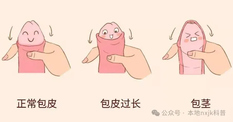 - 包茎:包皮口狭窄,无法上翻露出龟头,甚至影响排尿(尿线细、包皮鼓包)。