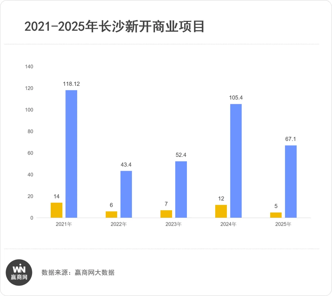 以省会长沙为例,2021年是近五年来数量和体量的供应顶峰,新开商业项目数量高达14个,且总规模达到118.12万方,入市的新项目不仅密集,且多为大体量商业体。2025年新开项目仅5个,总体量为67.1万方,数量为五年最低。