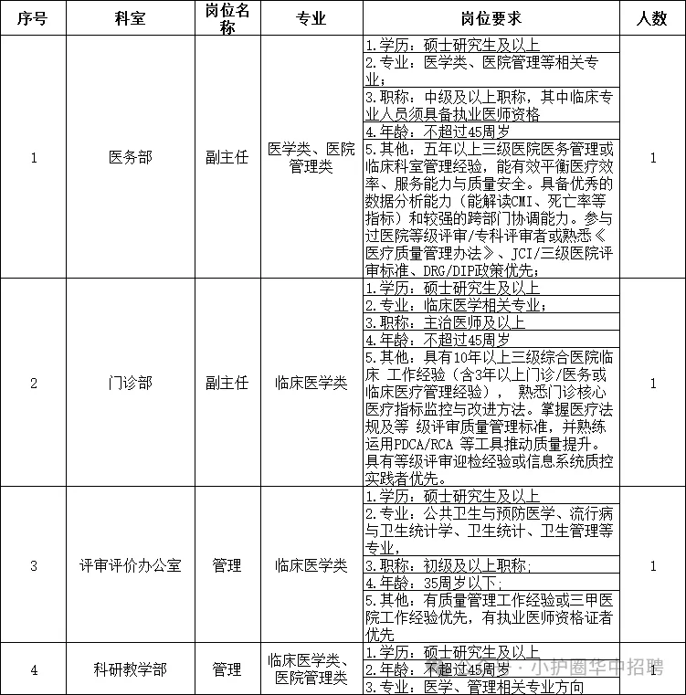 (四)管理岗:4人,其中医务部副主任1人,门诊部副主任1人;