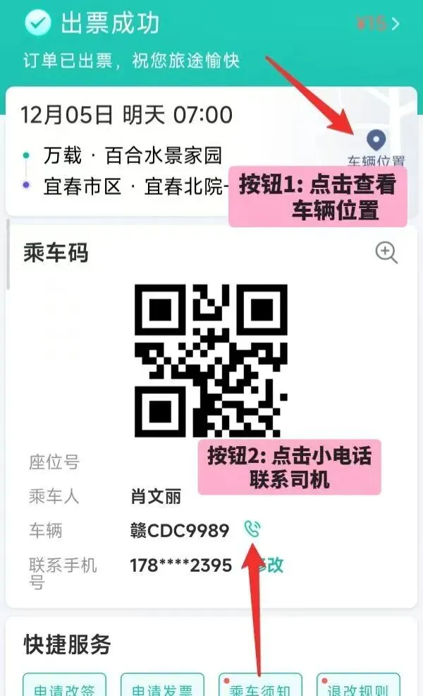 4、购票成功后,订单中查询接送车号和司机电话。