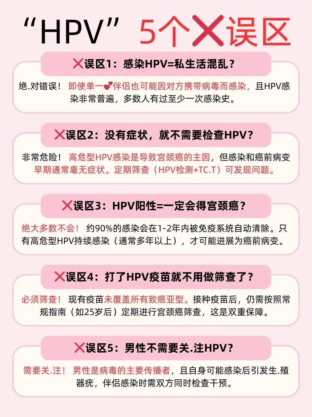 粉色科普图片上,五个红色叉号醒目地标记了关于HPV的常见错误认知,提醒每一位女性重新审视自己的健康观念。