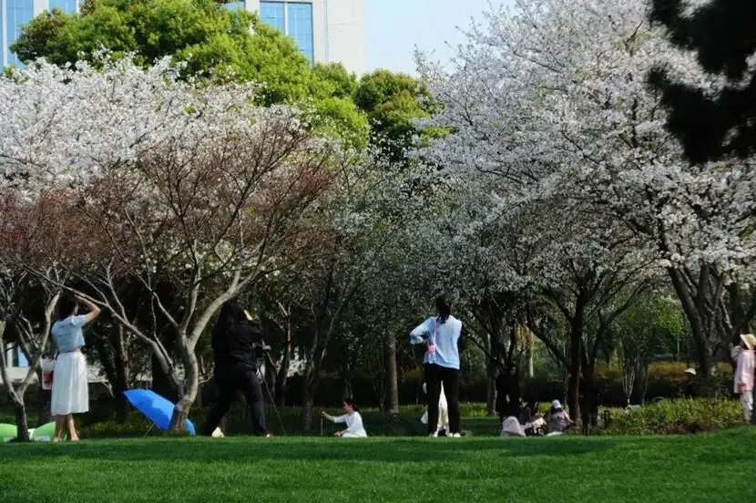 樱花树枝长得很低,伸手就能碰到花瓣,下面还有大片草丛当背景,自带森系滤镜,安安静静赏樱、拍几张照片,太舒服了。