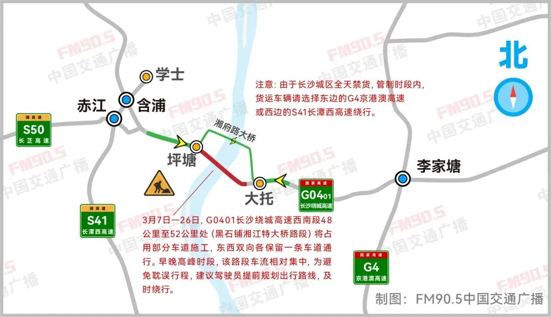 由于长沙城区全天禁货,管制时段内,货运车辆请选择东边的G4京港澳高速或西边的S41长潭西高速绕行。