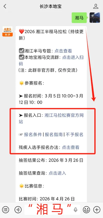 或者扫描下方二维码,关注【长沙本地宝】,在后台对话框回复【湘马】即可直接获取报名入口啦~