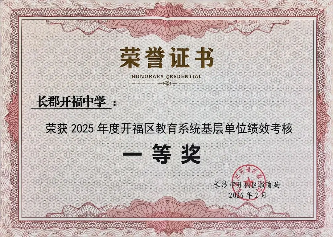 喜报|热烈祝贺长沙市长郡开福中学荣获2025年度开福区教育系统基层单位绩效考核“一等奖”!