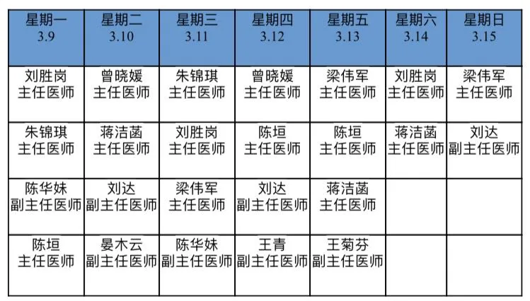 非常感谢您对南华大学附属长沙市中心医院呼吸与危重症医学科的信任,为了给您提供便捷的就诊服务,方便提前了解我科门诊排班情况,合理安排就诊时间,现将我科2026年3月9日-2026年3月15日门诊排班公示如下,如因工作调整,以当日实际出诊为准,您可以关注“长沙市中心医院”微信公众号预约挂号。