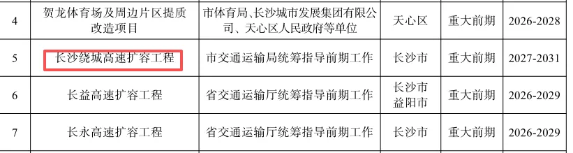在长沙市 2026 年重点建设项目清单中,长沙绕城高速扩容工程以重大前期项目的定位赫然在列。