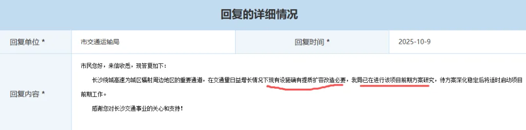 2025年10月份,长沙市交通运输局在答复网友时称:长沙绕城高速为城区福射周边地区的重要通道,在交通里日益增长情况下现有设施确有提质扩容改造必要,我局已在进行该项目前期方案研究,待方案深化稳定后将适时启动项目前期工作。