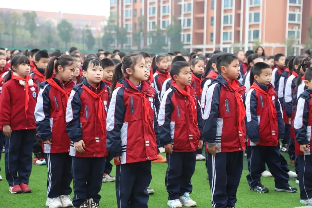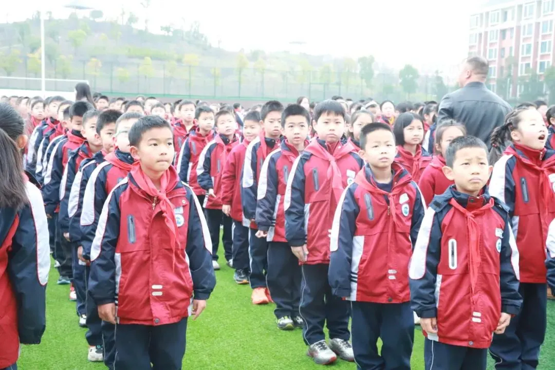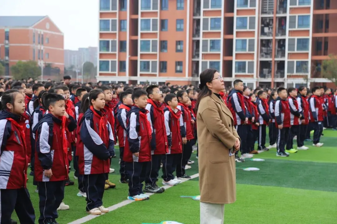 全体师生肃立,向后转!在激昂的国歌声中,鲜艳的五星红旗冉冉升起。全体师生行注目礼,少先队员行队礼。