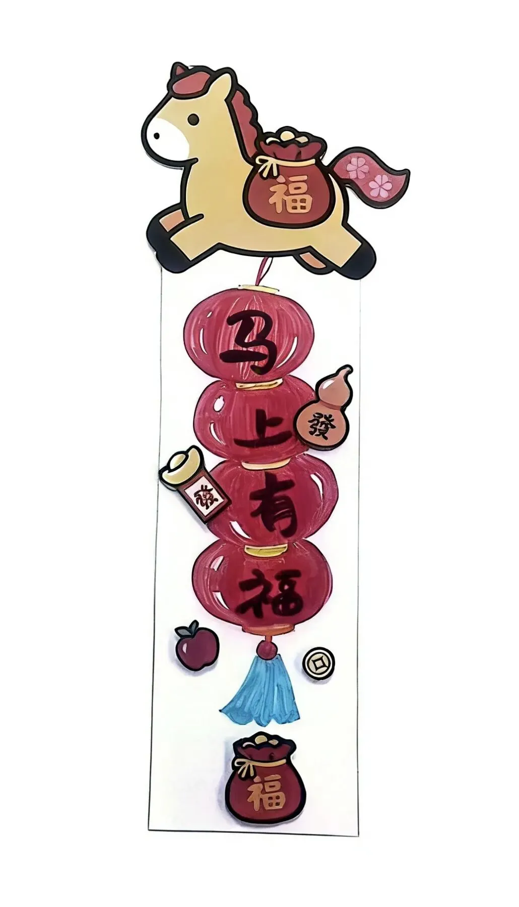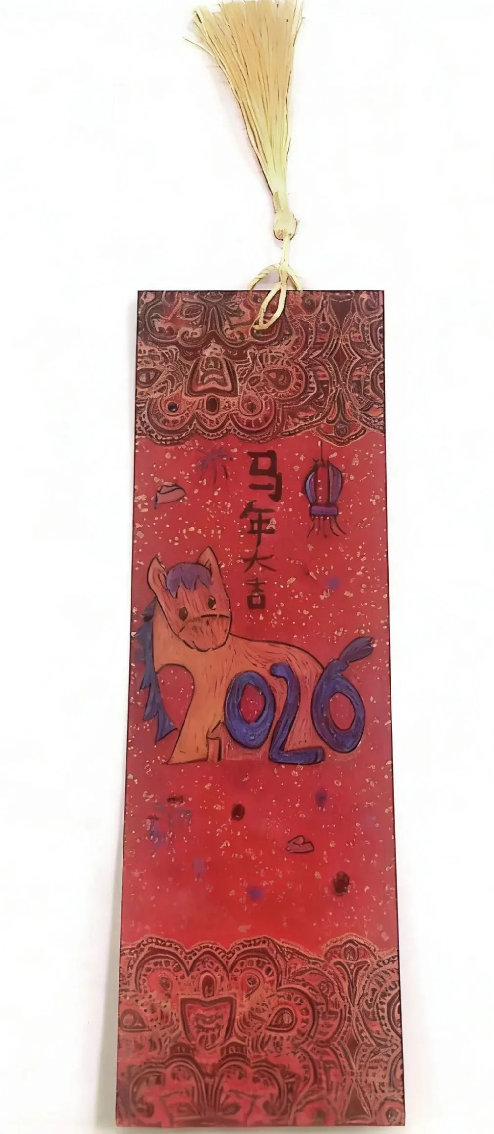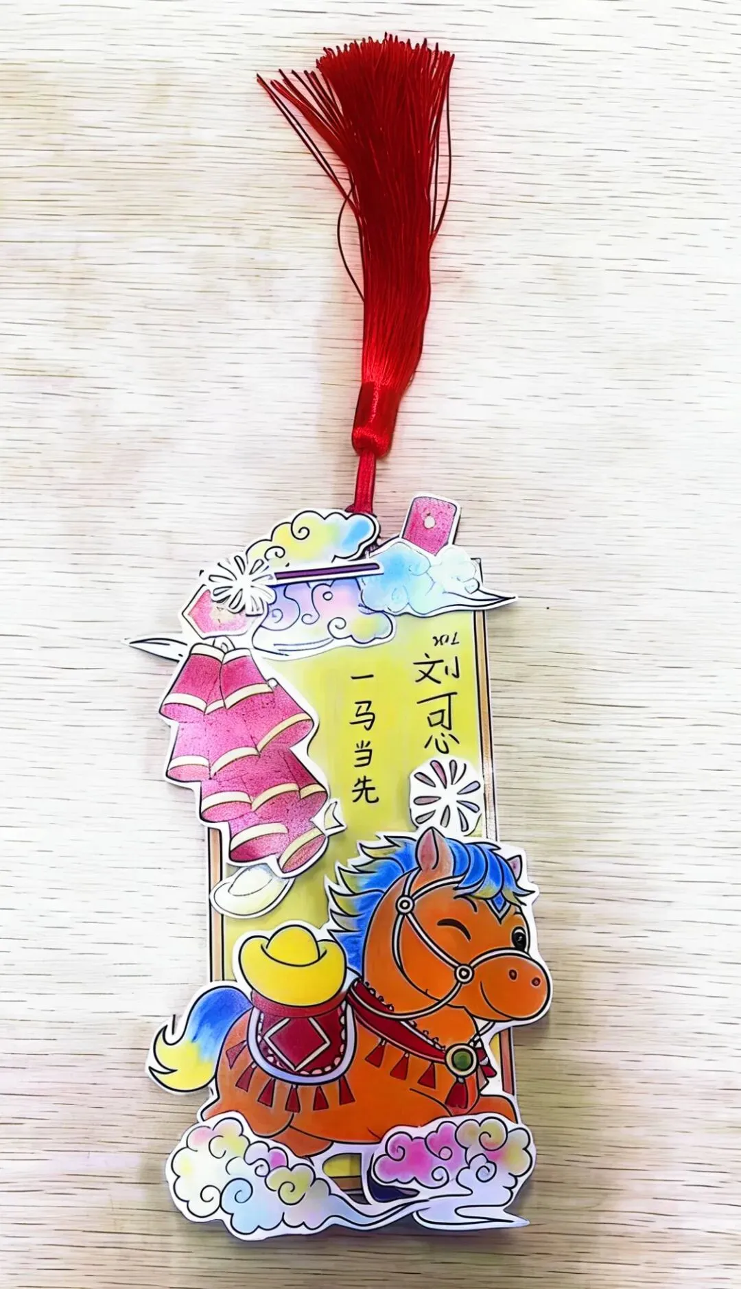 一年级的同学们以巧手制作创意书签,将阅读的喜爱与童真的巧思融入方寸之间。他们用灵动的线条、明快的色彩,勾勒出可爱的萌马图案与“一马当先”“马上有福”的温馨话语,让小小的书签成为阅读路上最美的陪伴。一枚枚精致的作品,不仅装点了书页,更点亮了孩子们最初的阅读热爱。