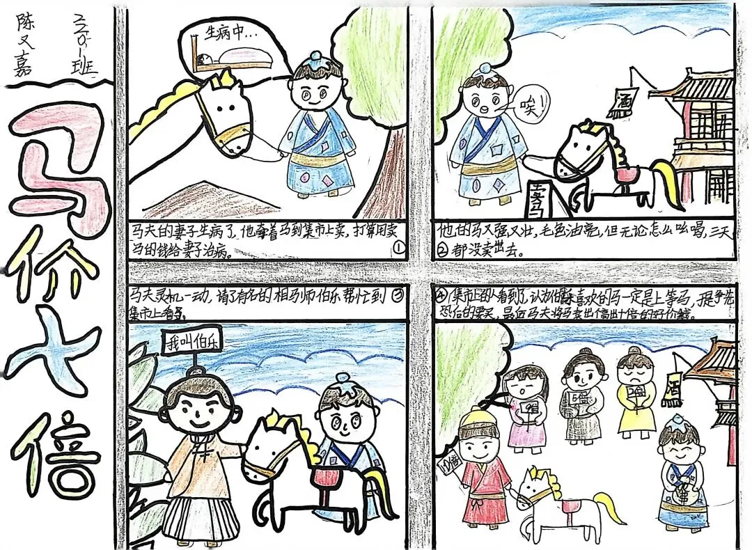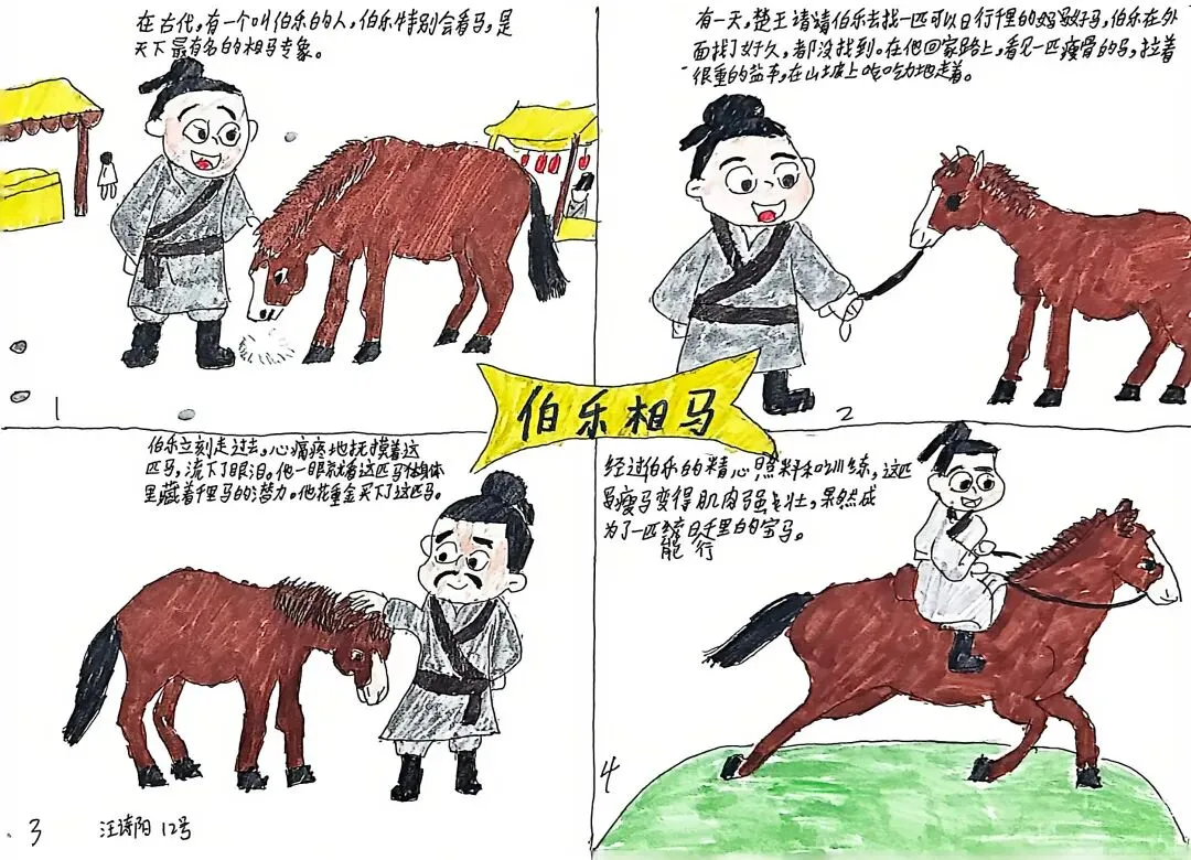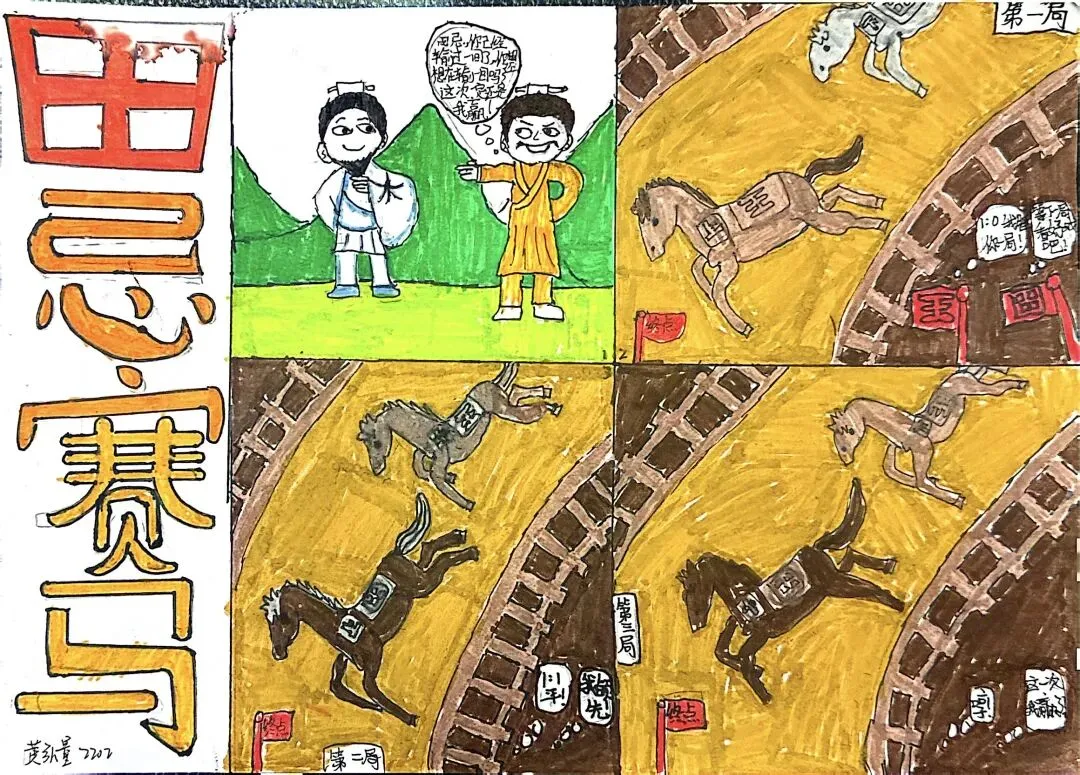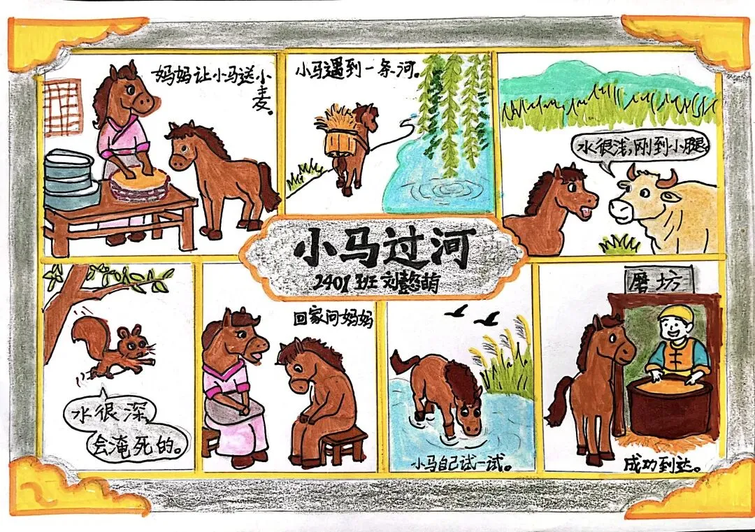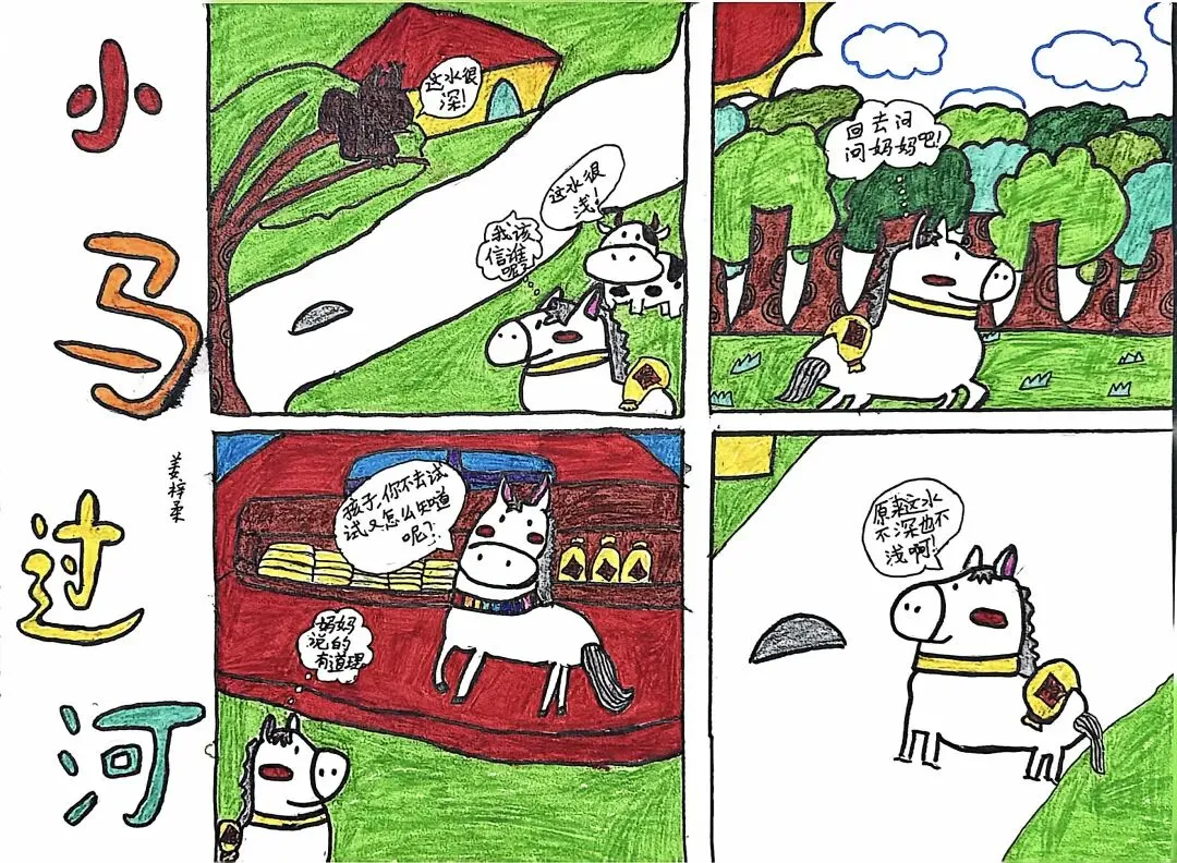 四年级的同学们以连环画的形式,再现《小马过河》《田忌赛马》等经典故事的精彩片段。一格格画面连贯生动、层次清晰,一段段文字简洁凝练、情真意切。他们在图文结合的创作中,加深对故事的理解,提升整体构思与表达能力,让阅读真正看得见、摸得着、记得住。