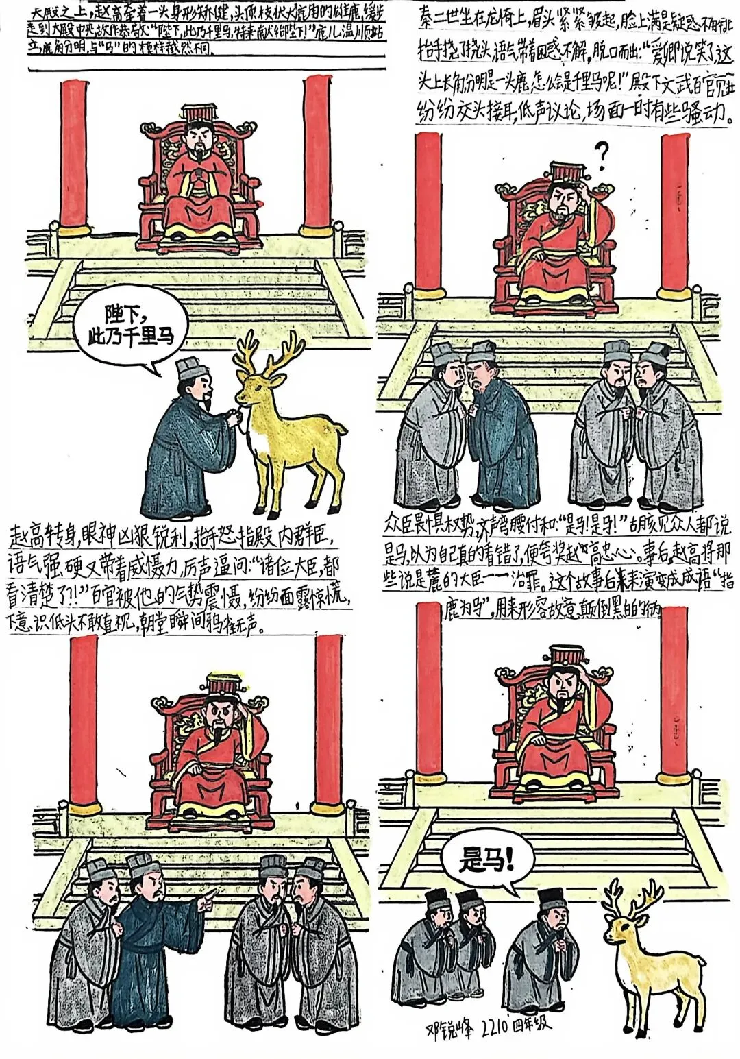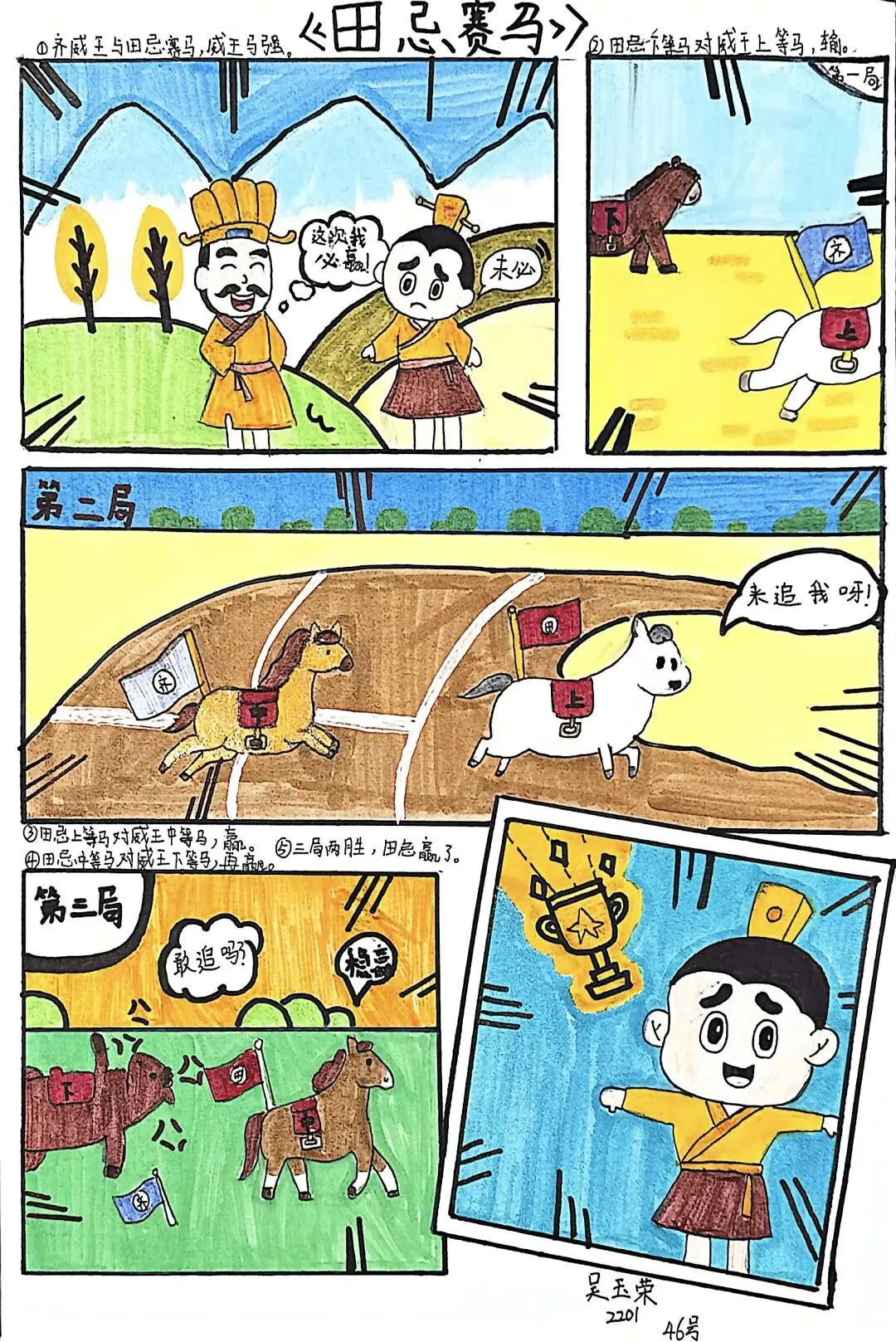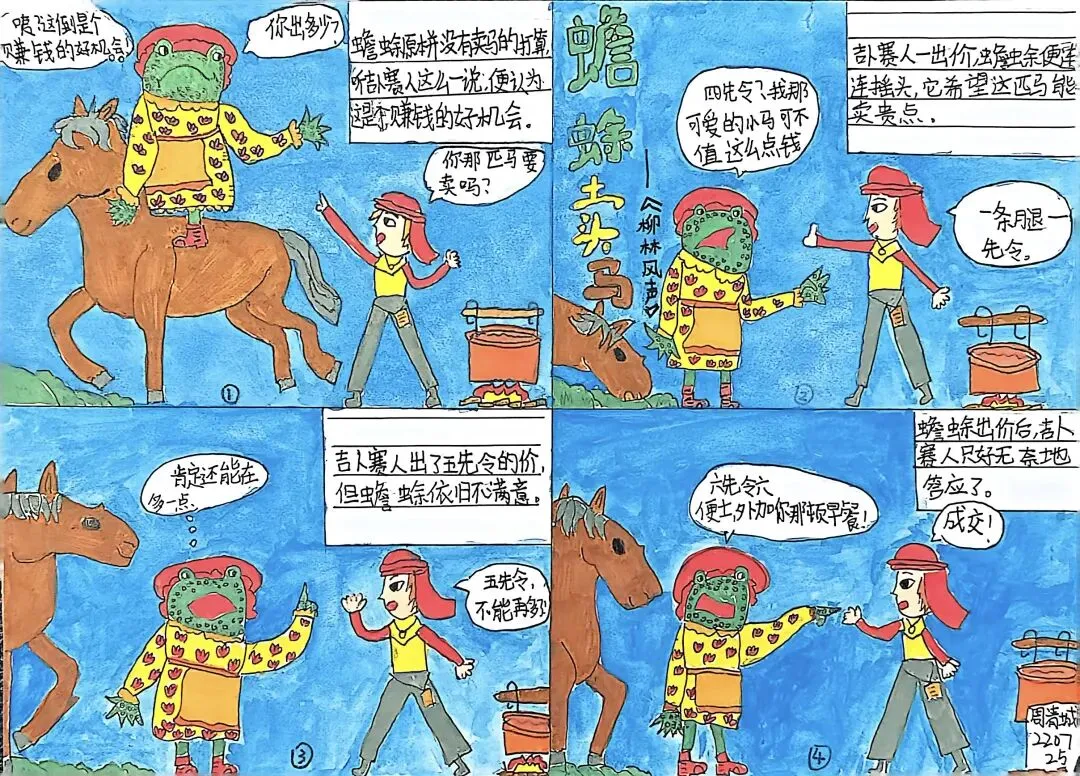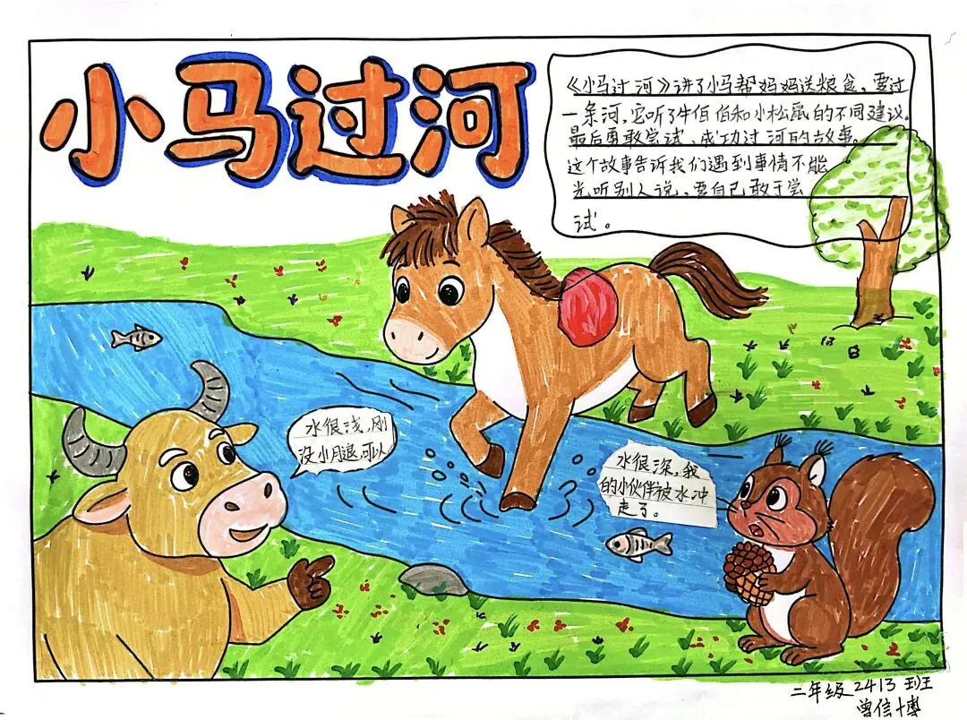 四年级的同学们以连环画的形式,再现《小马过河》《田忌赛马》等经典故事的精彩片段。一格格画面连贯生动、层次清晰,一段段文字简洁凝练、情真意切。他们在图文结合的创作中,加深对故事的理解,提升整体构思与表达能力,让阅读真正看得见、摸得着、记得住。