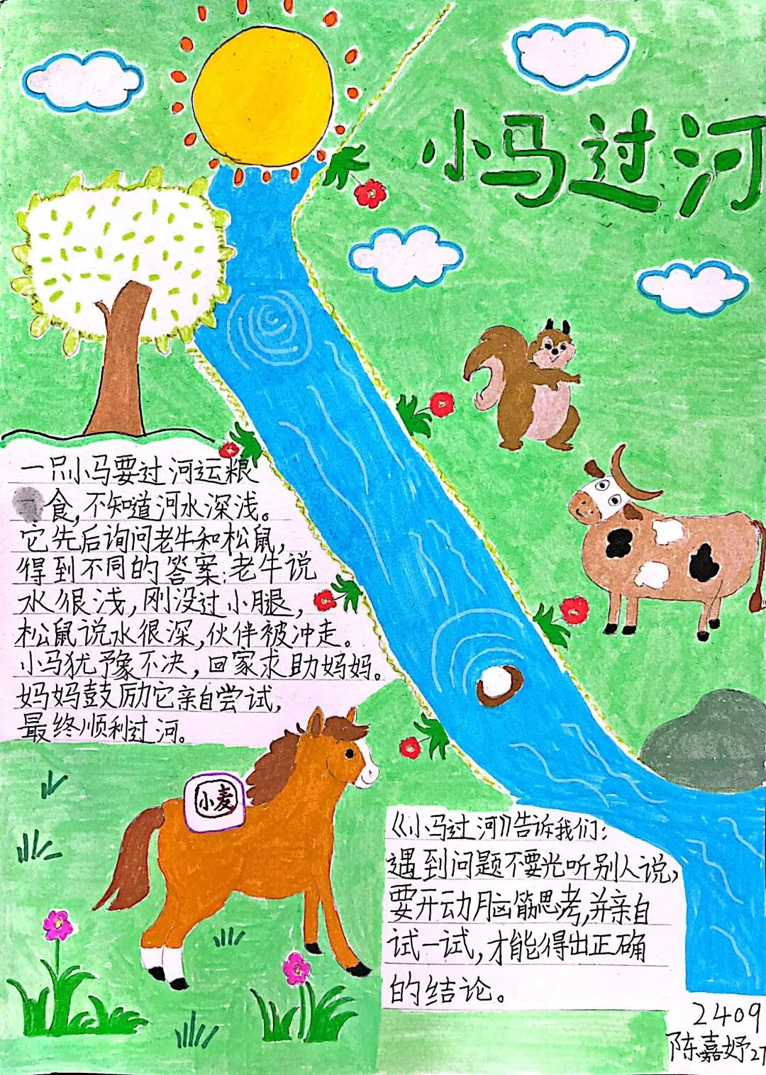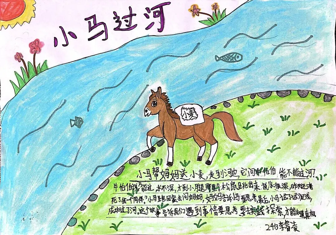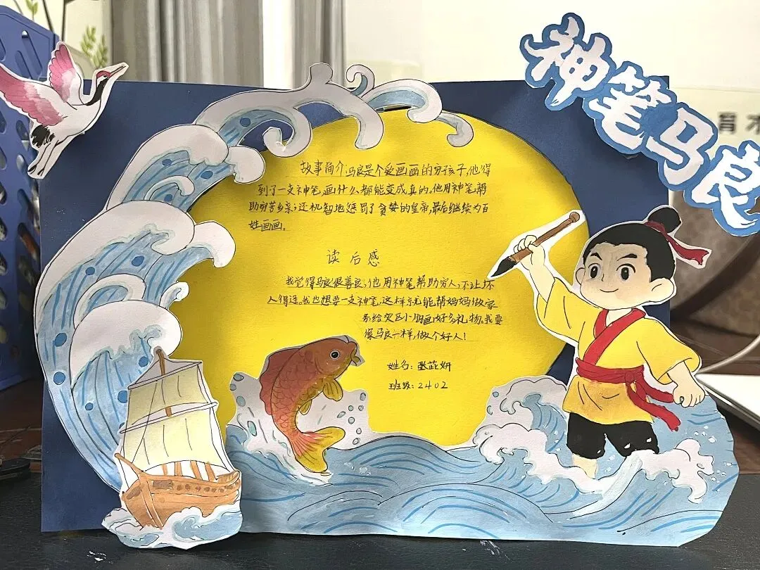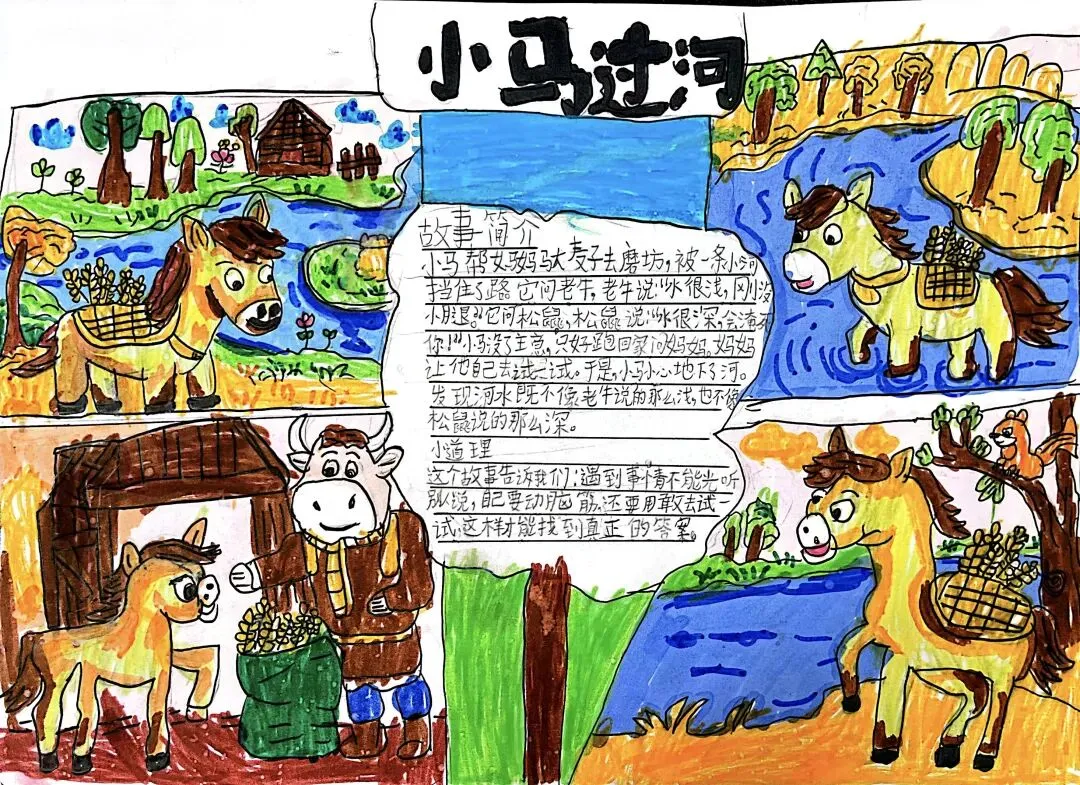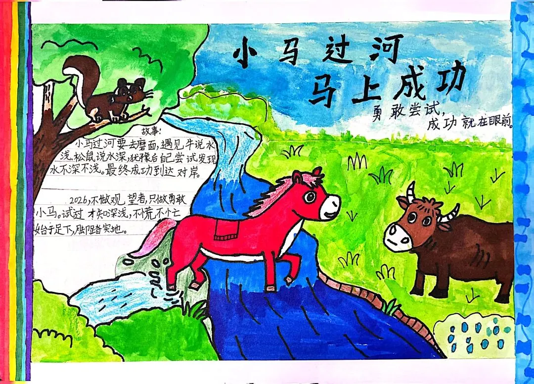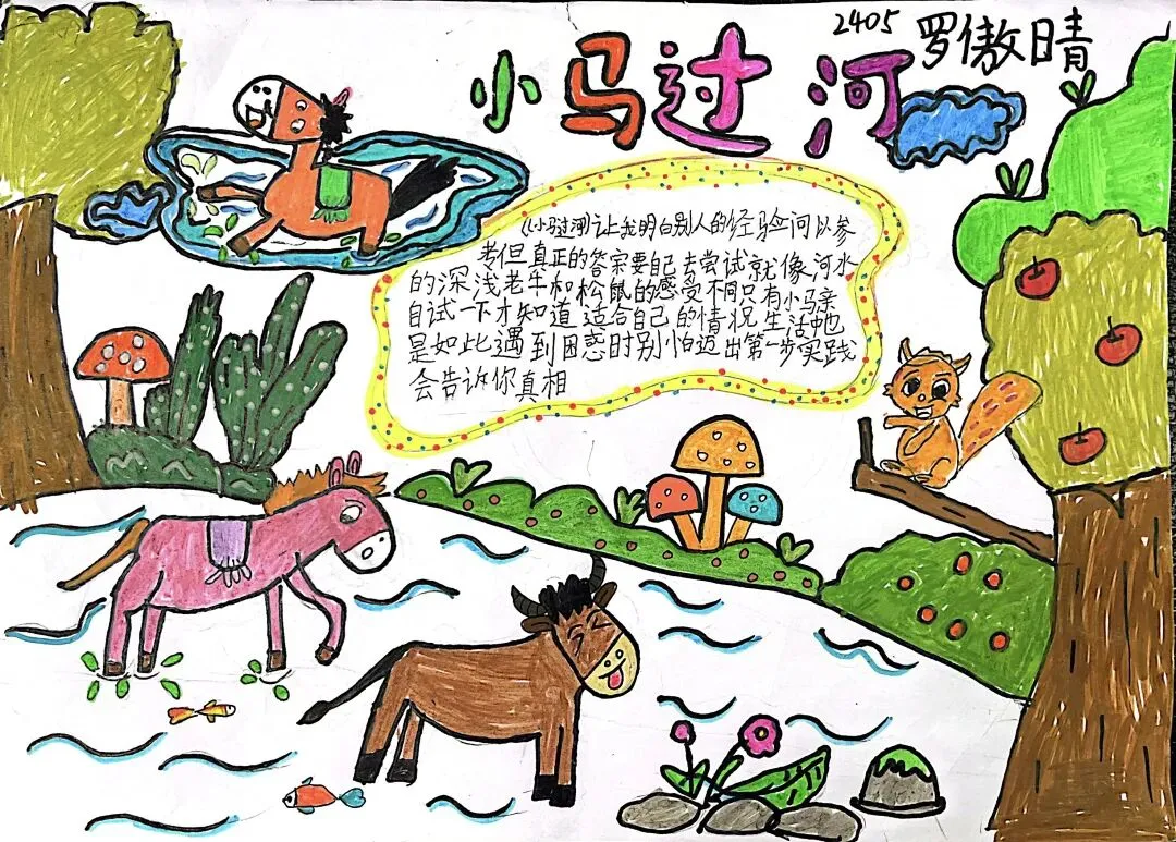 二年级的小读者们以《小马过河》《神笔马良》等经典故事为蓝本,将阅读感悟凝于笔端,以丹青再现故事场景。他们用细腻的笔触勾勒人物,用斑斓的色彩铺展情节,把勇敢尝试、向善而行的美好品质,藏进每一幅画面之中。作品图文并茂、意趣盎然,是童心对经典最生动的诠释。